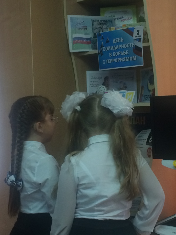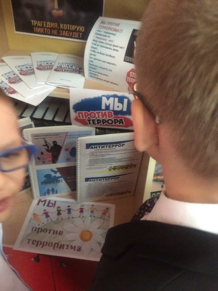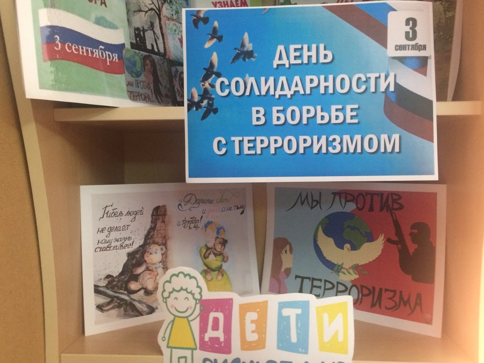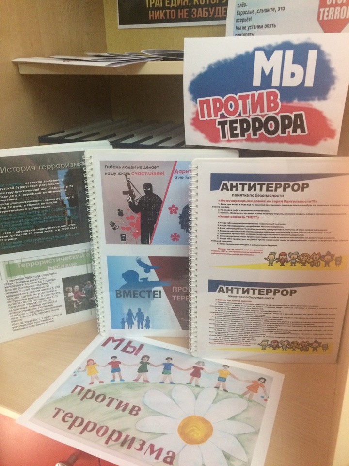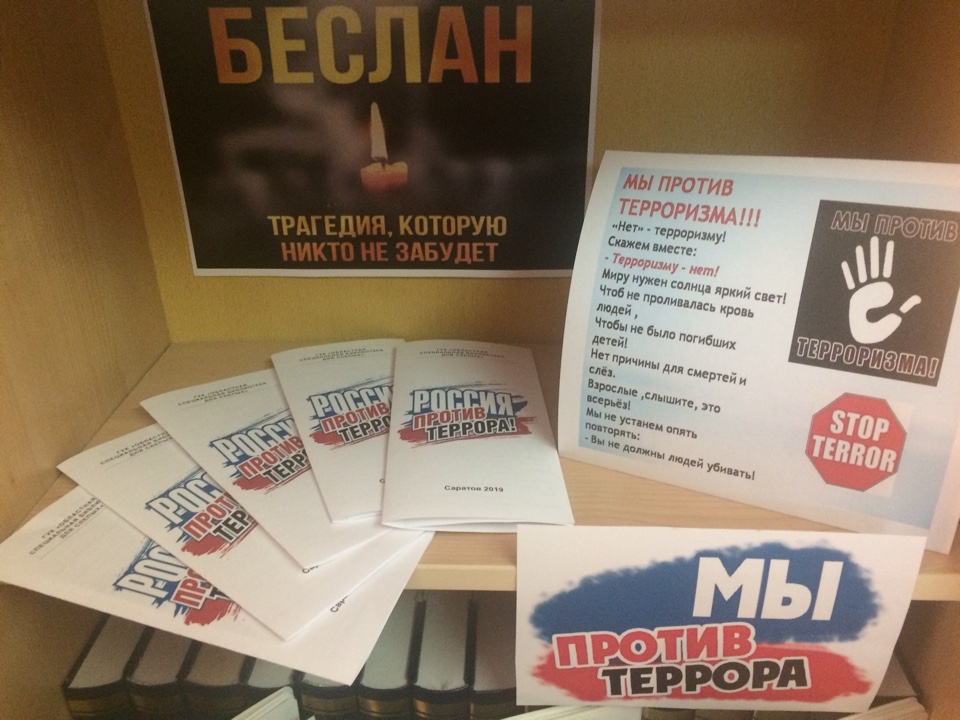 В детском филиале Саратовской областной специальной библиотеки для слепых открылась выставка-обзор «Мы против террора», на которой были представлены книги и статьи из периодических изданий. У выставки проводились беседы и дискуссии о проблемах межнациональной толерантности, дружбы, взаимопонимания. Сотрудник библиотеки напомнила посетителям о том, как важно знать правила поведения при угрозах теракта, рассказали о мерах предосторожности в столь непростых ситуациях. Всем читателям в этот день вручались памятки «Вы обнаружили подозрительный предмет», «Номера телефонов экстренных служб», «Если вы оказались в заложниках».