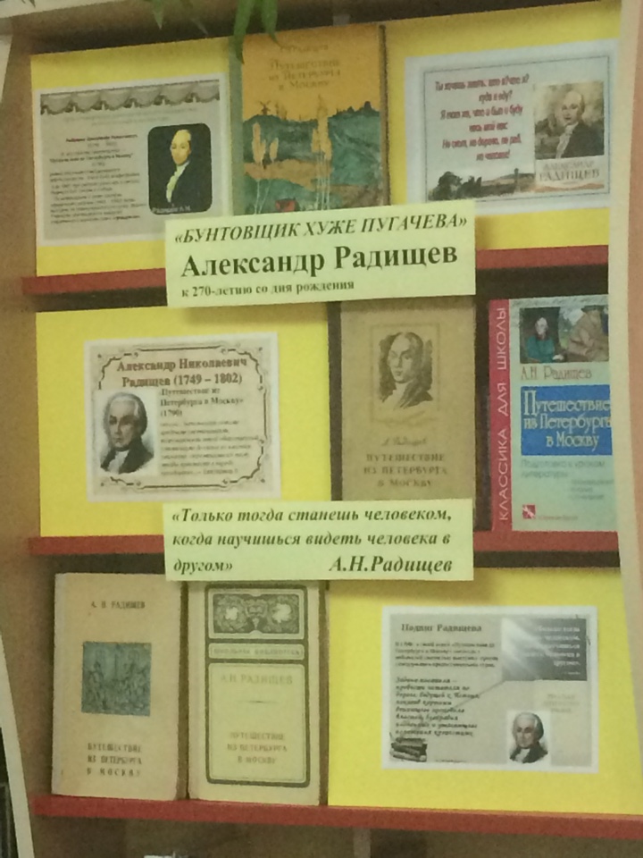 В Детском филиале Саратовской областной библиотеки для слепых открыта к посещению выставка «Бунтовщик хуже Пугачёва», посвящённая 270-летию со дня рождения А.Н. Радищева (1749–1802).