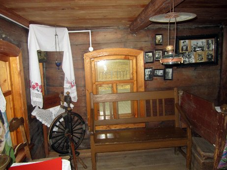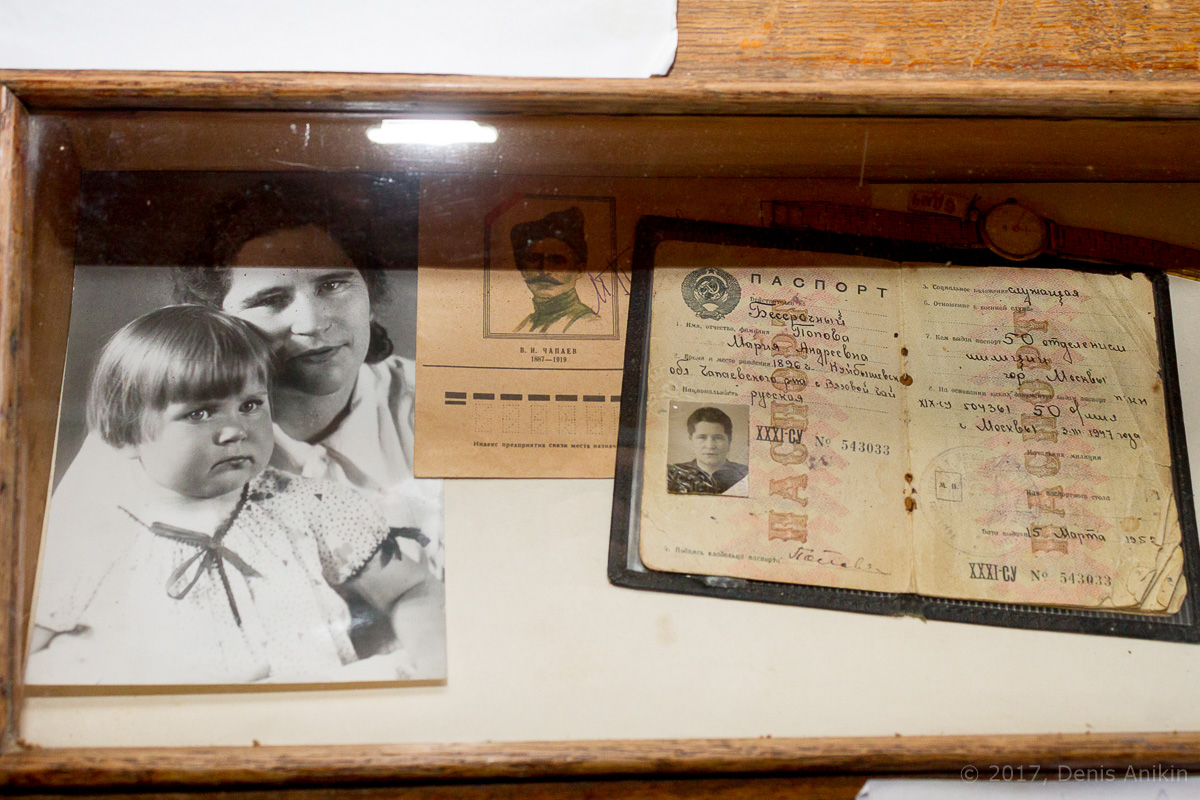 В комнате рядом с русской печью висят бурка, шашка (муляж) и папаха красноармейца, у кровати на стене – семейные фотографии Чапаевых в рамках.