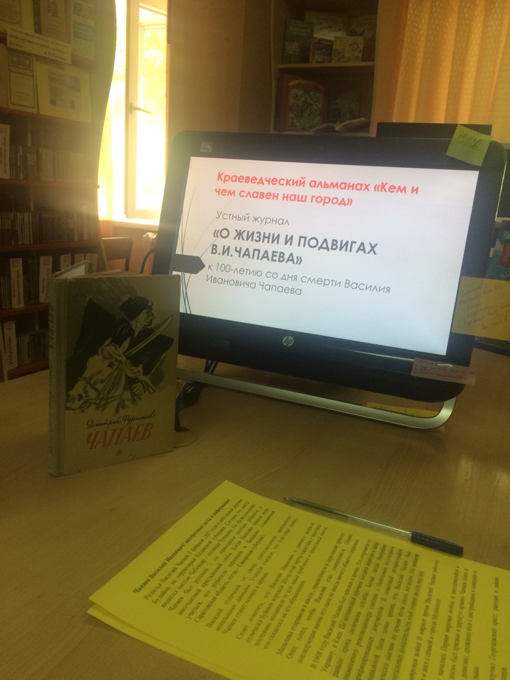 В детском филиале ГУК «Областная специальная библиотека для слепых» с начала 2019 года успешно реализуется совместный с историко-краеведческим центром «Наследие» проект – краеведческий альманах «Кем и чем славен наш город». Устный журнал «О жизни и подвигах В.И. Чапаева», посвященный 100-летию со дня смерти легендарного полководца, состоялся для учащихся средних классов ГБОУ СО «Школа-интернат АОП № 3 города Саратова».