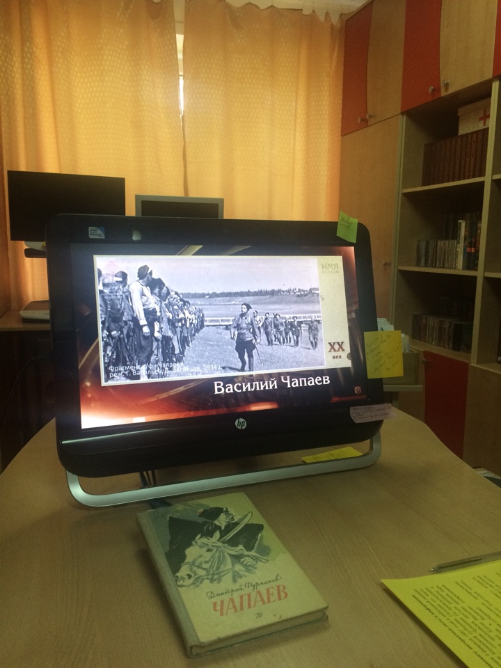 Присутствующим рассказали о биографии В.И.Чапаева. Вместе с ведущими Поповой Л.Л. и Ледневой Л.Г. они обсудили обстоятельства гибели легендарного начдива. Рассказ гармонично дополнялся кадрами из фильма «Чапаев».