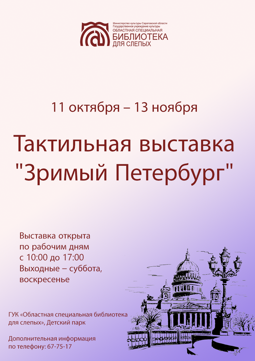 Саратовская областная специальная библиотека для слепых и Санкт-Петербургская Государственная специальная центральная библиотека для слепых и слабовидящих в рамках Соглашения о творческом взаимодействии представляют передвижную тактильную выставку «Зримый Петербург».
