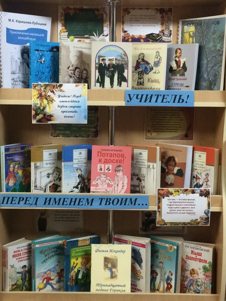 Накануне праздника в Детском филиале ГУК «Областная специальная библиотека для слепых» была оформлена книжно-иллюстративная экспозиция «Учитель! Перед именем твоим…». На выставке представлены художественные произведения русских, советских авторов о школе, учениках и личности учителя в широком диапазоне.