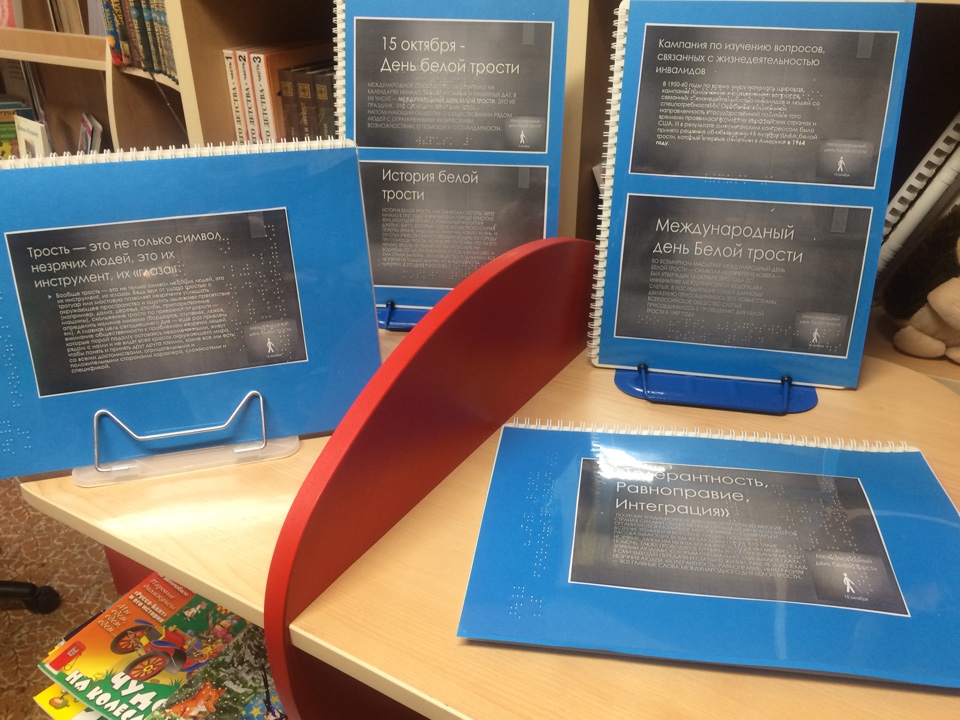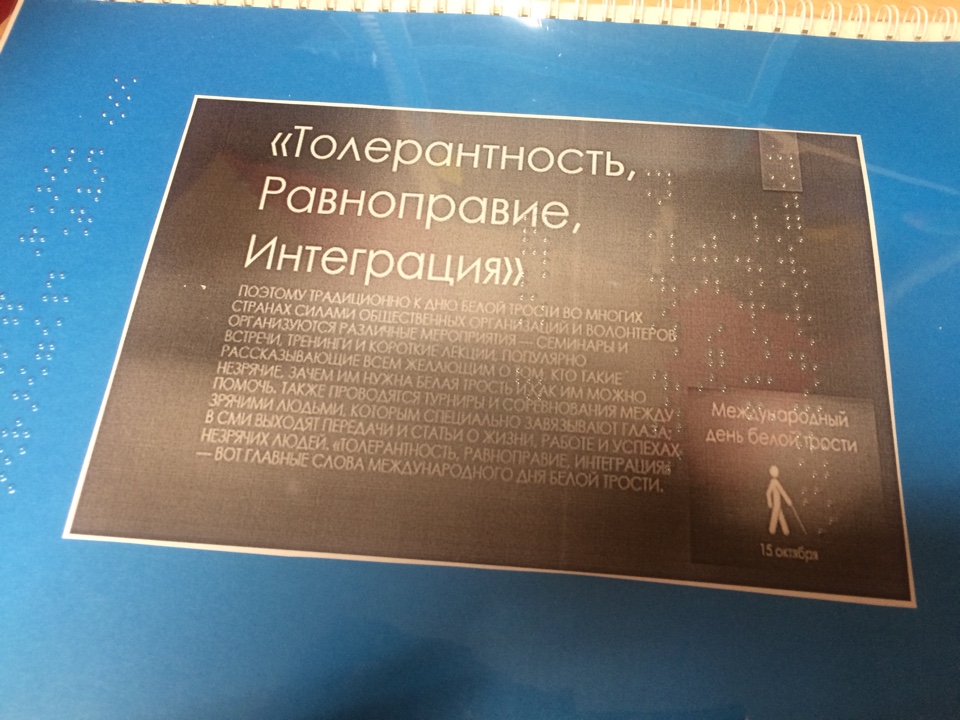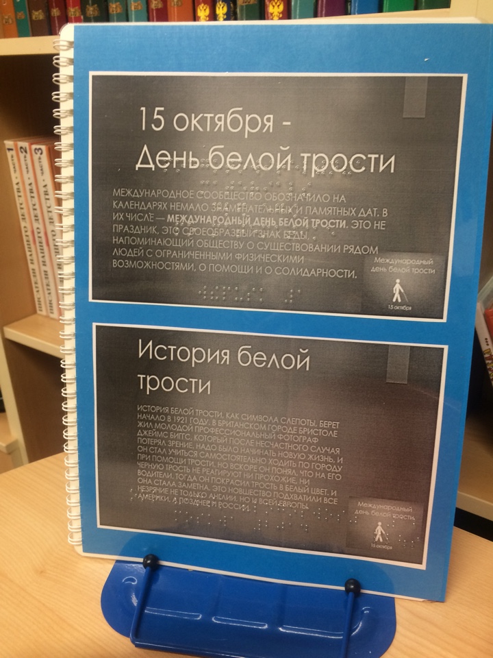 В рамках празднования Международного дня Белой трости в детском филиале ГУК «Областная специальная библиотека для слепых» была организована экспозиция – информирование об истории появления Белой трости в жизни незрячих людей. Во время посещения экспозиции ребята узнали, почему символом незрячего человека стала именно белая трость? Маленькие читатели узнали, что история белой трости, как символа слепоты, берет начало в 1921 году. Но только через много лет во всех странах стали официально внедрять белую трость среди инвалидов по зрению, которая сегодня является не только символом незрячих людей, это их инструментом, их «глазами». Речь шла и о том, что незрячие люди участвуют в общественной жизни общества, учатся в школах и в высших учебных заведениях, играют в театре, на музыкальных инструментах, исполняют песни, занимаются спортом, ребят призвали более внимательно относиться к своим незрячим и слабовидящим одноклассникам и взрослым. Ведь милосердие и забота – это лучшие человеческие качества, которые надлежит воспитывать в себе с детства. «Толерантность, Равноправие, Интеграция» – вот главные слова Международного дня белой трости. Наиболее активными участниками разговора стали Фунтова Настя (2в класс), Максимова Даша (3а класс), Лобецкий Иван (4а класс), Фугаров Никита (4а класс).
