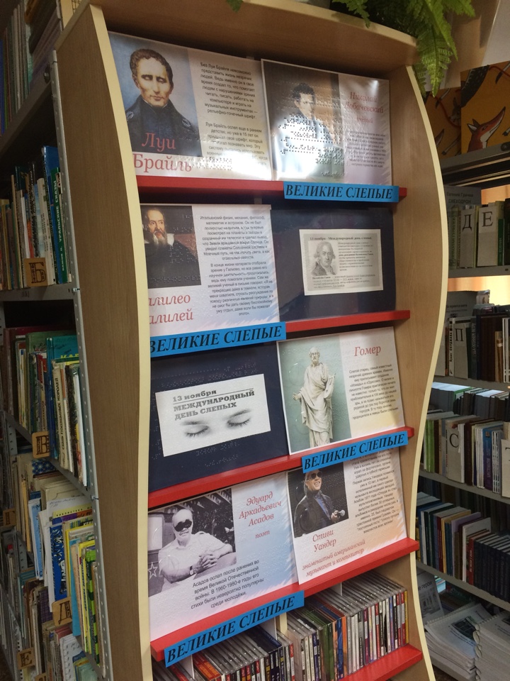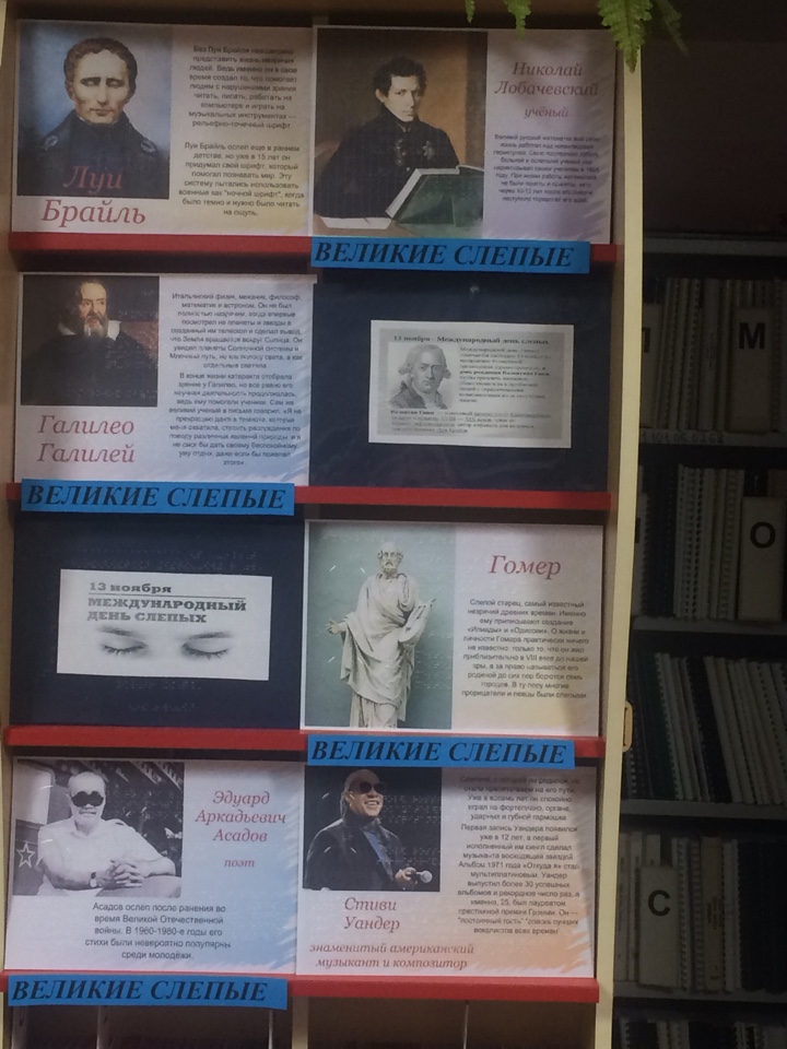 В Детском филиале ГУК «Областная специальная библиотека для слепых» организована экспозиция «Великие слепые», приуроченная к Международному дню слепых.