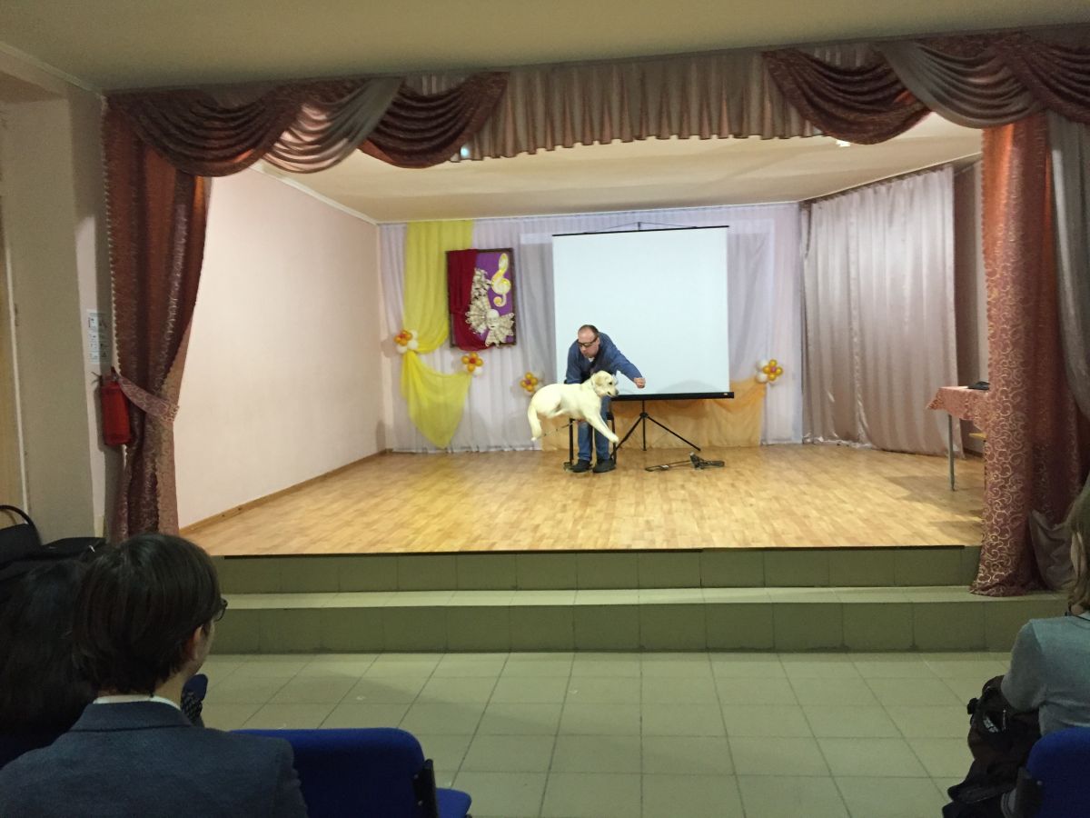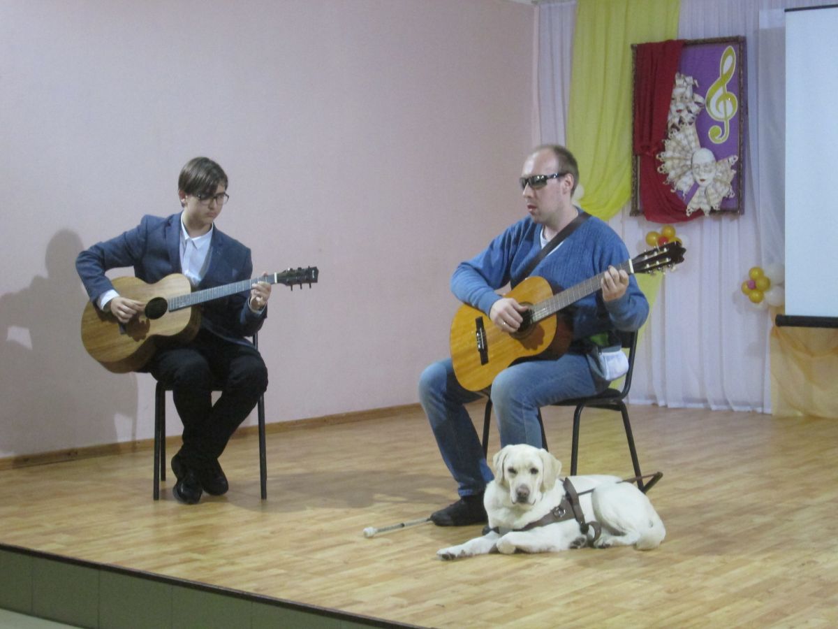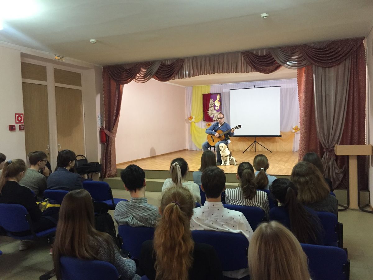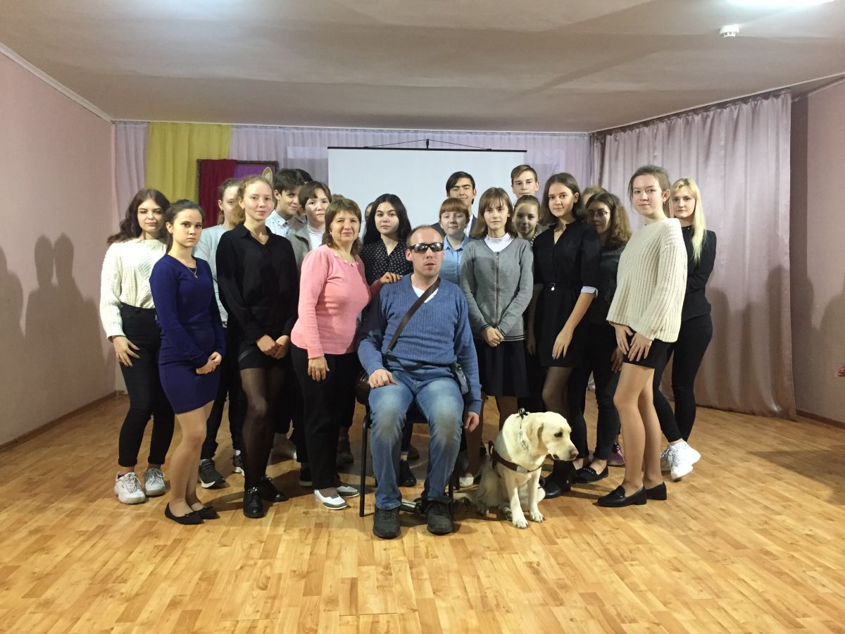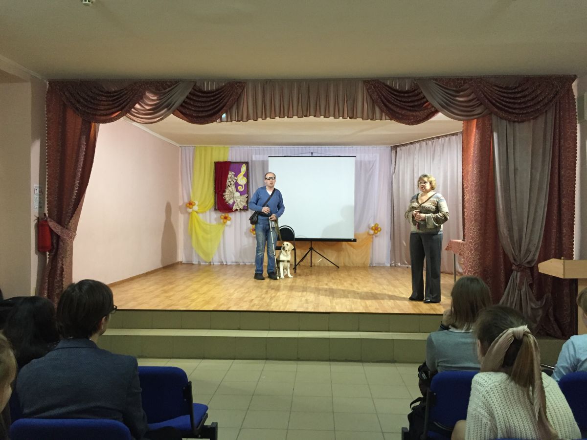Встреча-импульс «Если с другом вышел в путь…» (в рамках Месячника Белой трости) для старшеклассников СОШ №7 прошла, можно сказать, в форме спектакля под названием «Один день из жизни человека с собакой».