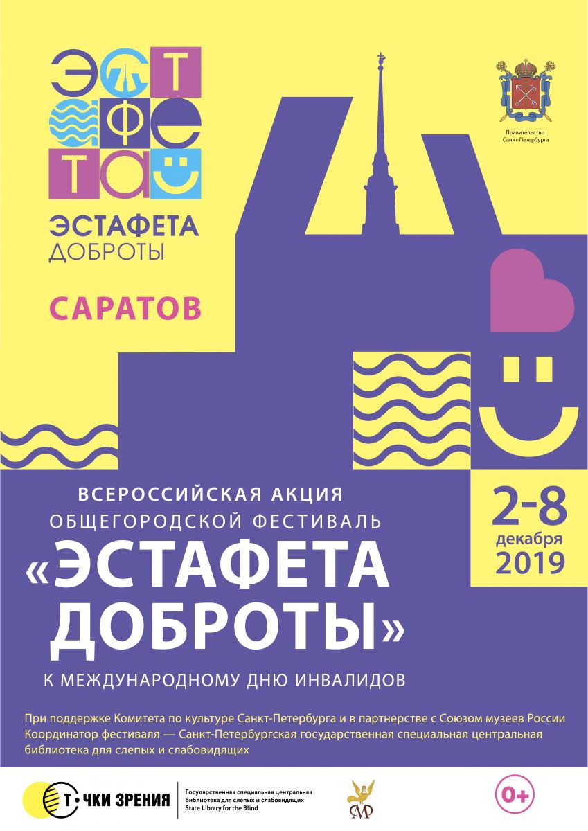 В этом году Областная специальная библиотека для слепых принимает участие во Всероссийской акции «Общегородской фестиваль “Эстафета доброты”», приуроченной к Международному дню инвалидов. Фестиваль проводится по всей России со 2 по 8 декабря 2019 года.