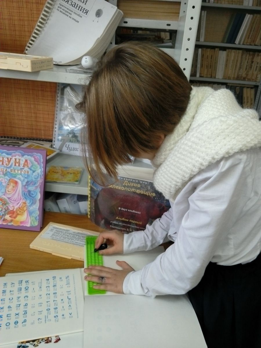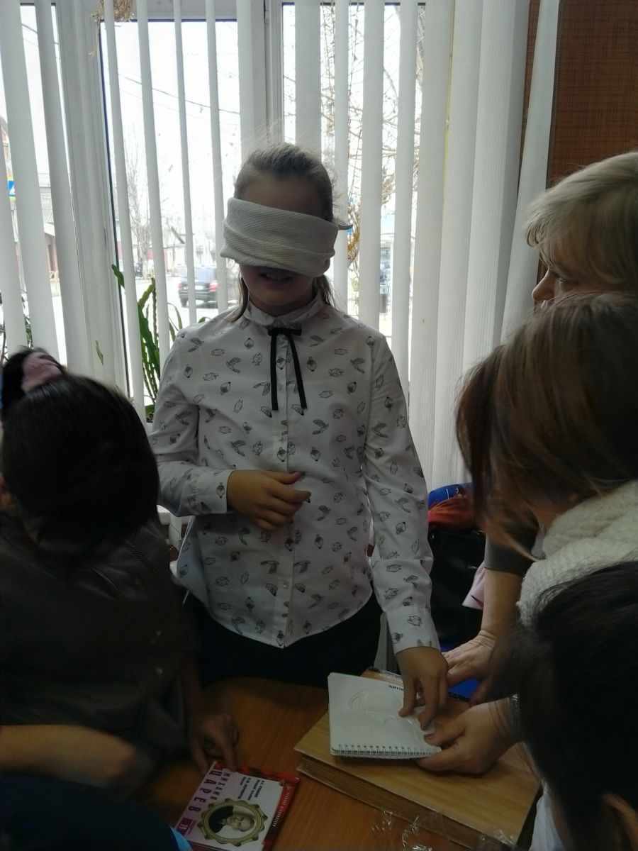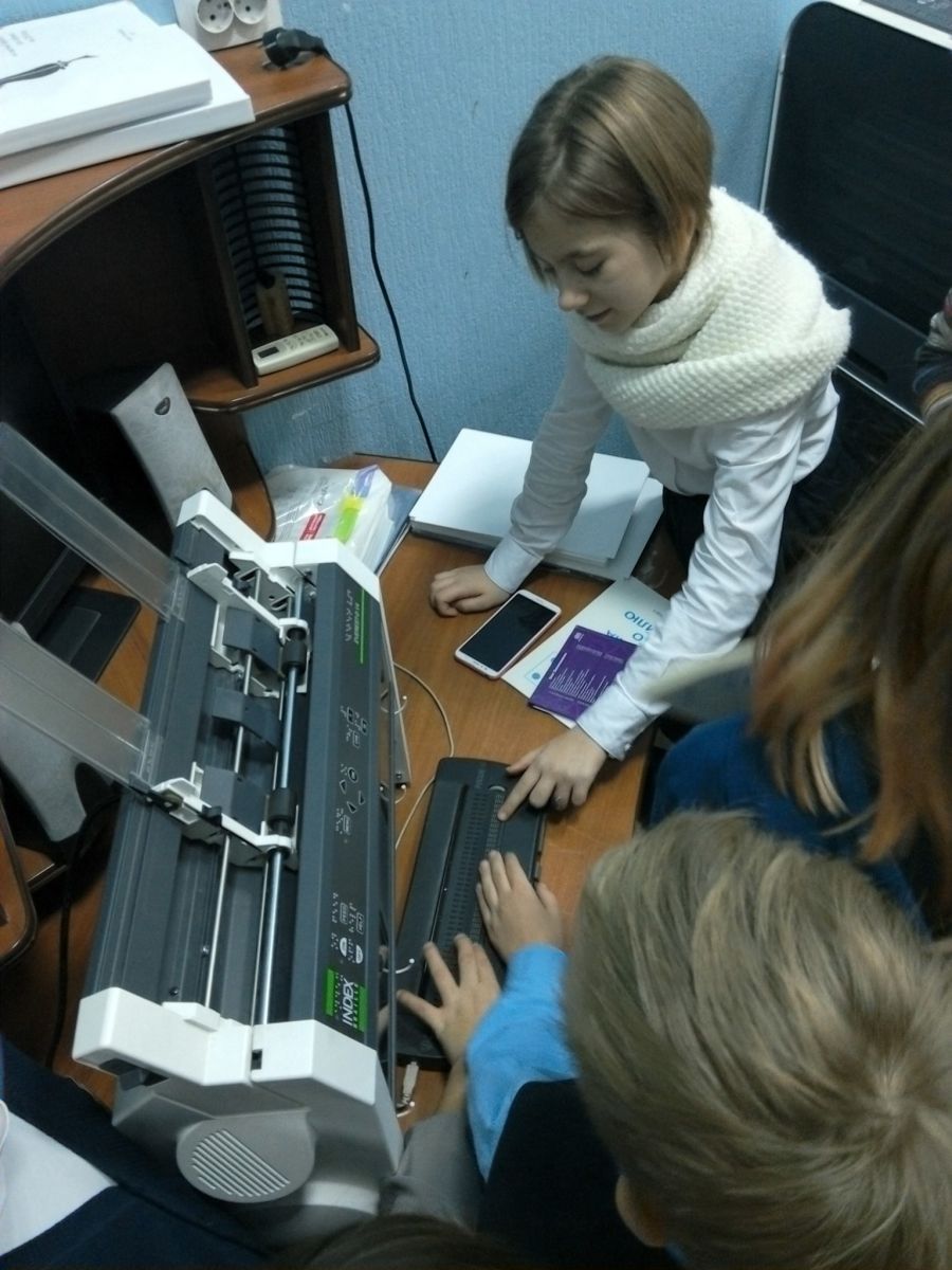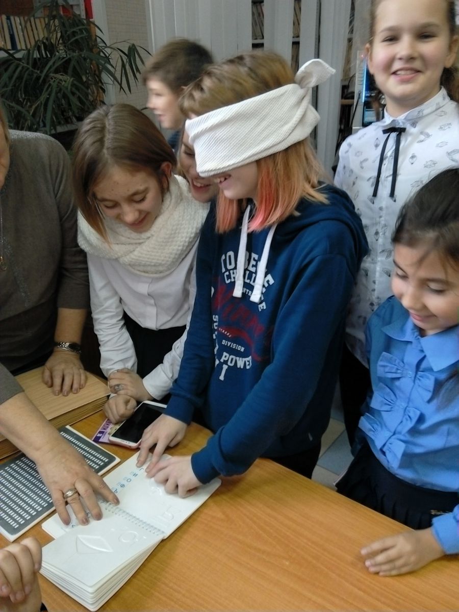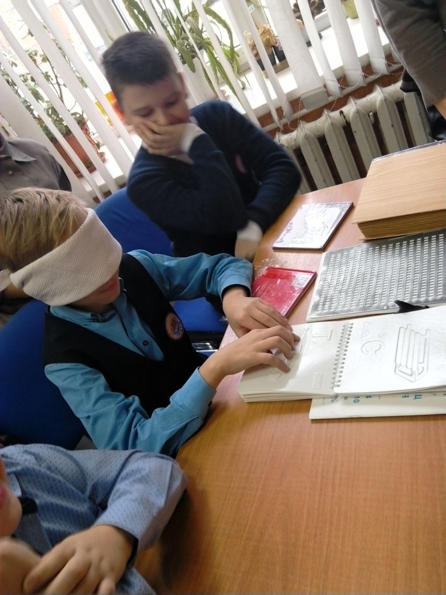 Дети пробовали писать по системе Брайля, отгадывали рельефно-графические картинки с завязанными глазами, «читали» книгу с помощью «говорящего» карандаша, пробовали свои силы в студии звукозаписи.