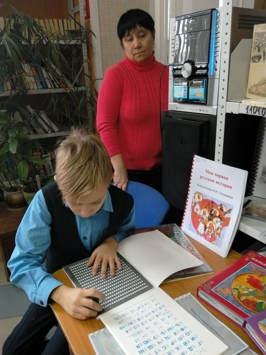 Детям подарены диски с произведениями школьной программы, тетради для письма по Брайлю. Дано задание: нарисовать голову человека с закрытыми глазами, а также сделать очерк о мероприятии, которое они посетили в библиотеке.