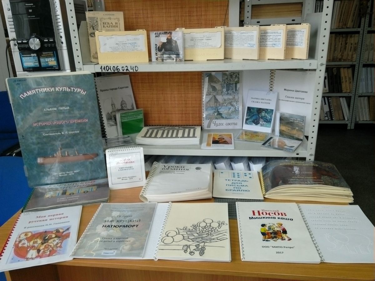 Организована выставка изданий нашей библиотеки на всех форматах, тактильных и рукодельных книг, а также РГП издательства «Логос» ВОС.