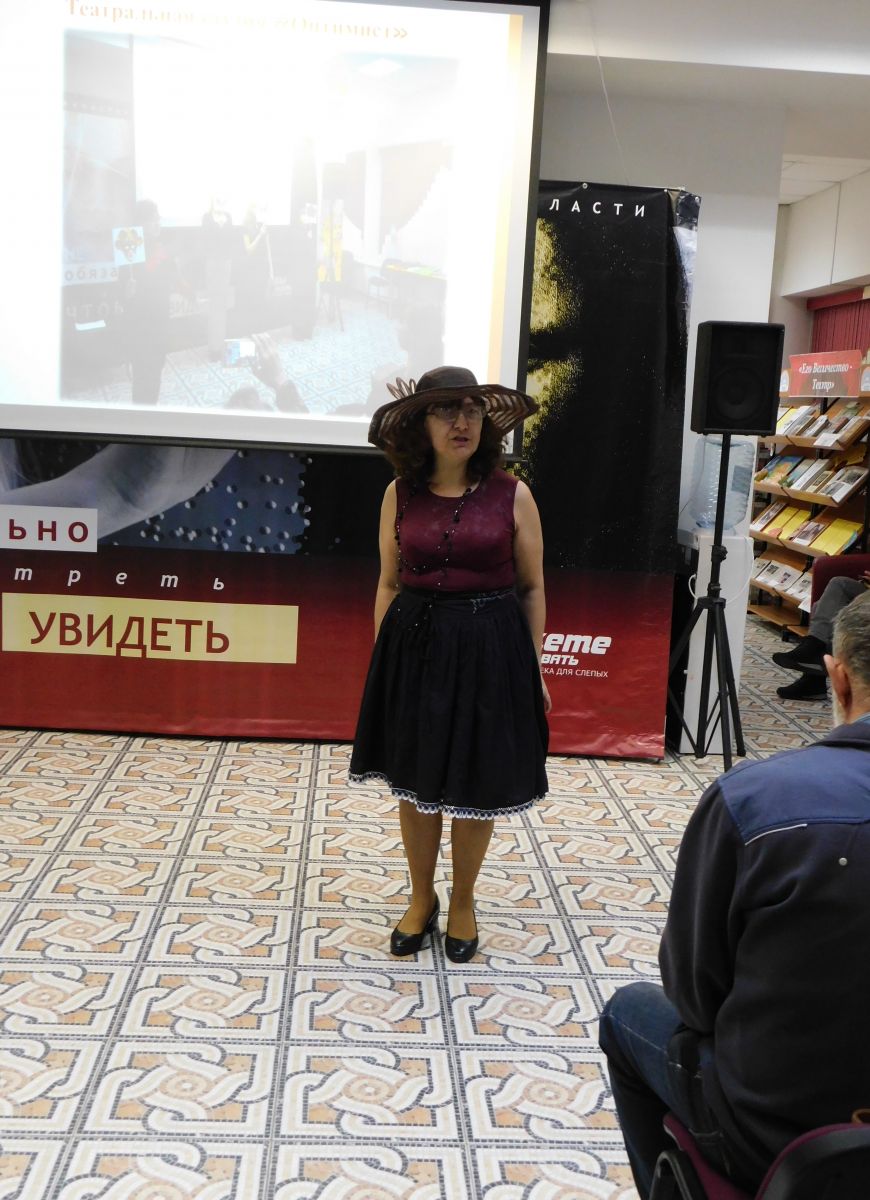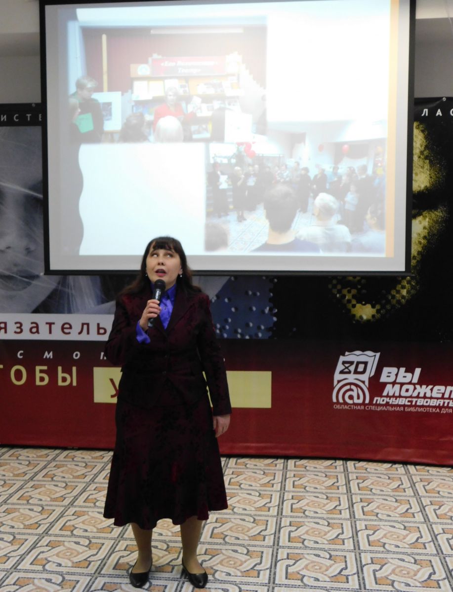 Директор Областной специальной библиотеки для слепых Ольга Новикова обратилась к присутствующим с приветственным словом, в котором отметила самые яркие мероприятия, проходившие в библиотеке в рамках Года театра, подвела итоги работы проекта «Театр для всех» Областной специальной библиотеки и её структурных подразделений. Проект был реализован в течение года в сотрудничестве с Саратовским государственным академическим театром драмы им. И.А. Слонова, ГАУК «Саратовский театр кукол «Теремок», театральной студией региональной организации Всероссийского общества слепых «Оптимист».