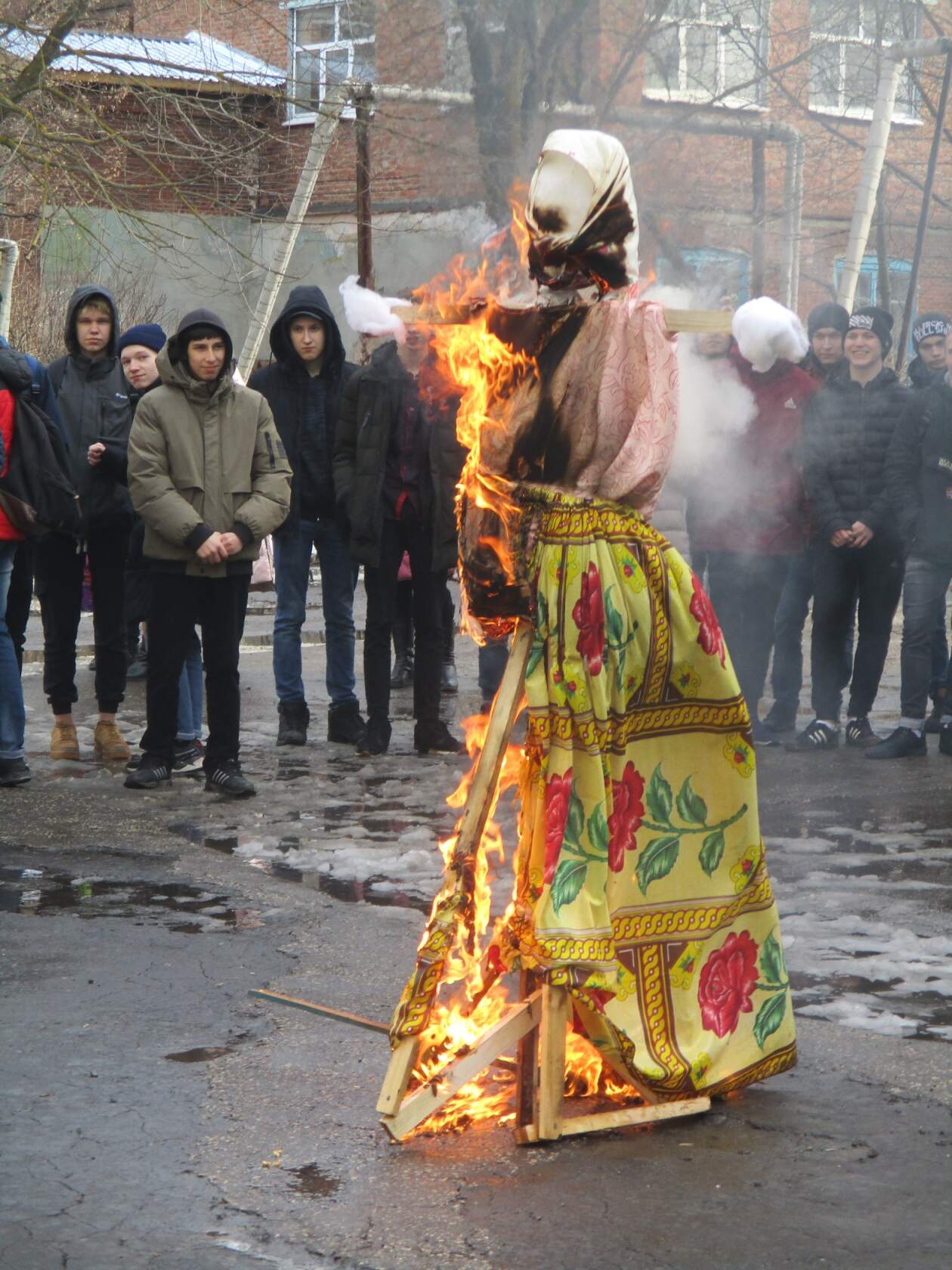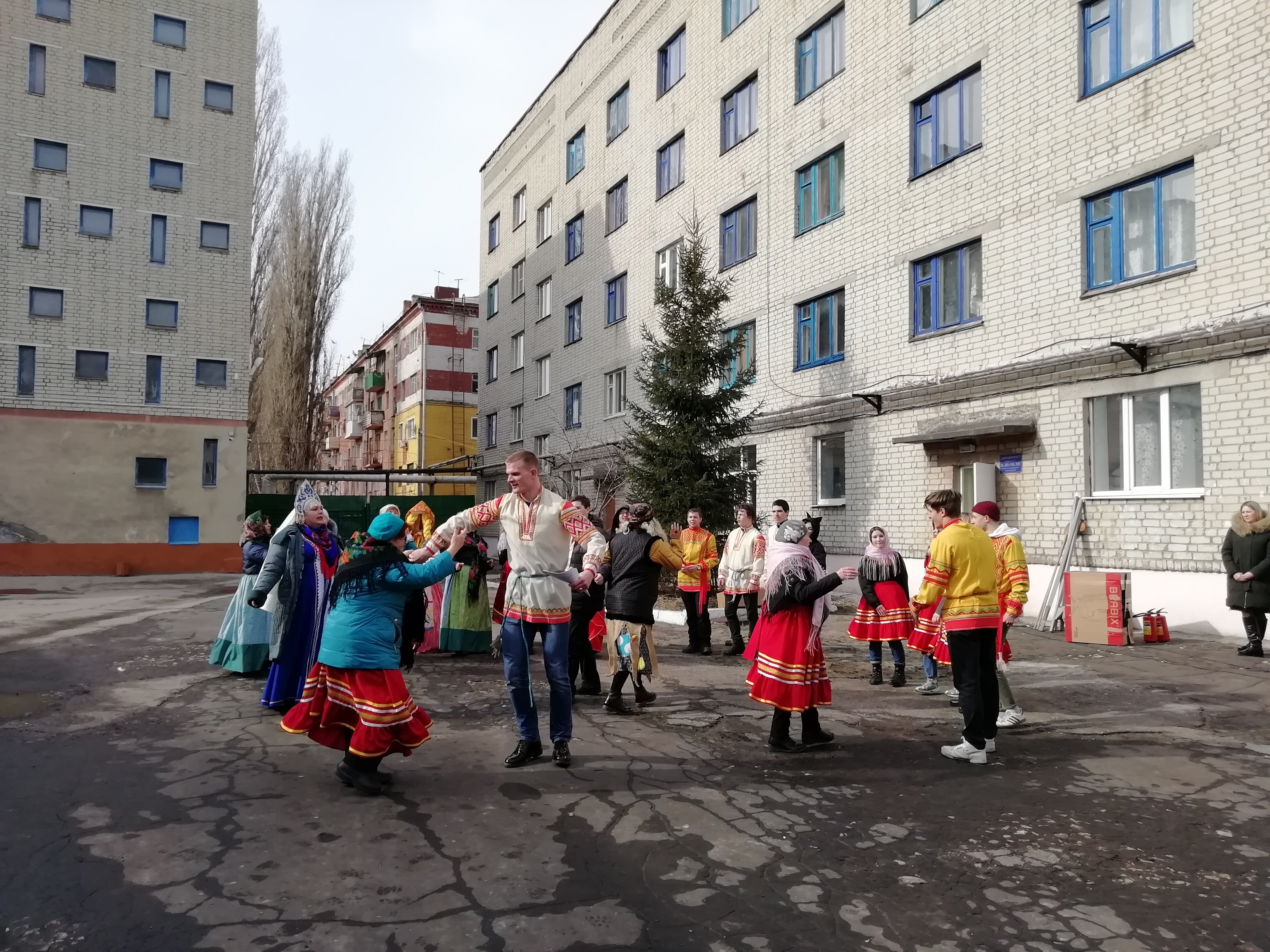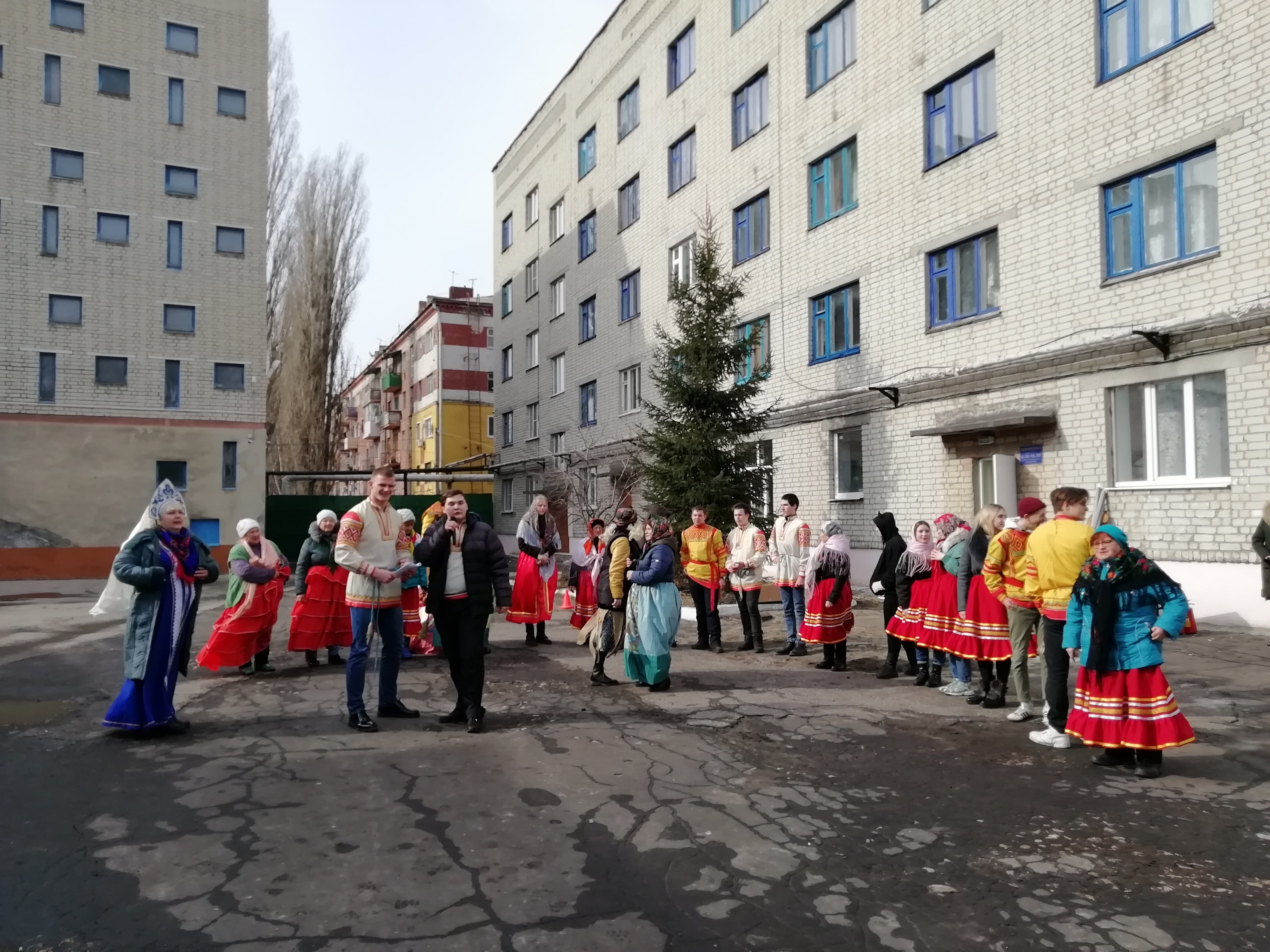 Празднование «Масленицы» проходило на базе техникума. Во дворе учебного заведения собралось более ста студентов, преподавателей и ряженые – артисты из числа инвалидов по зрению. «Серебряные» волонтёры организовали для присутствующих веселый «Разгуляй» с хороводами, песнями, играми и спортивными русскими забавами.