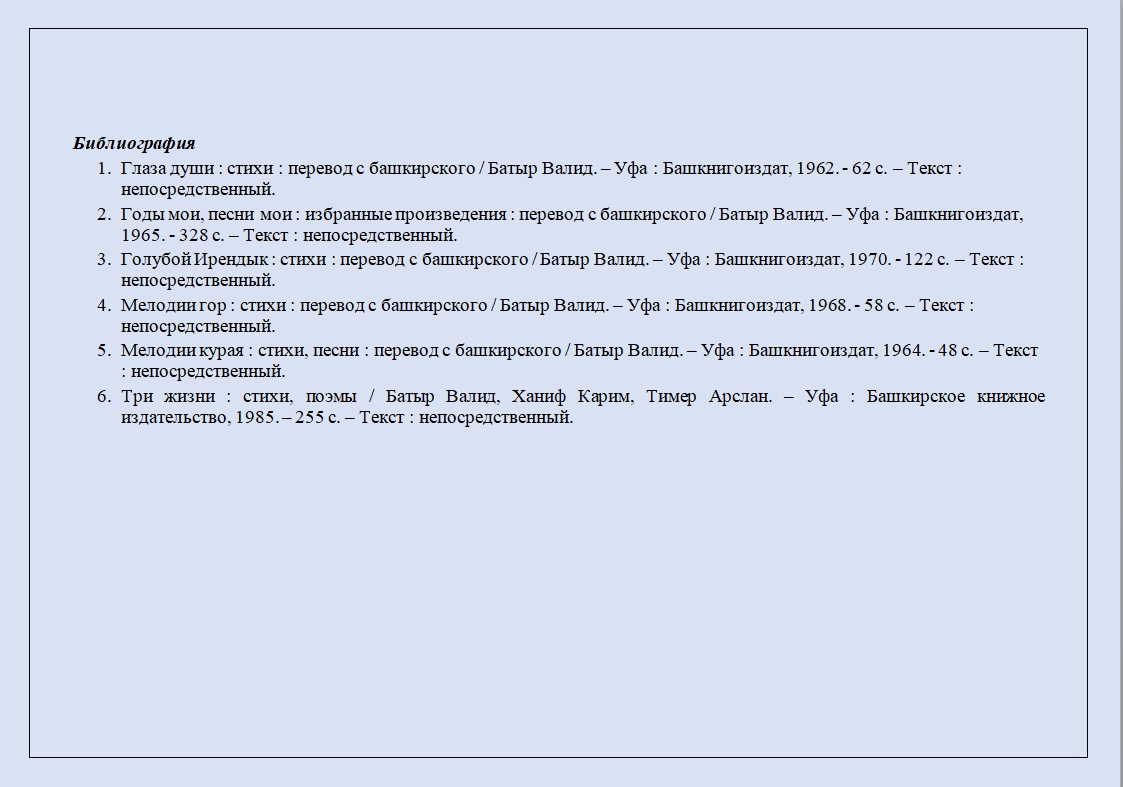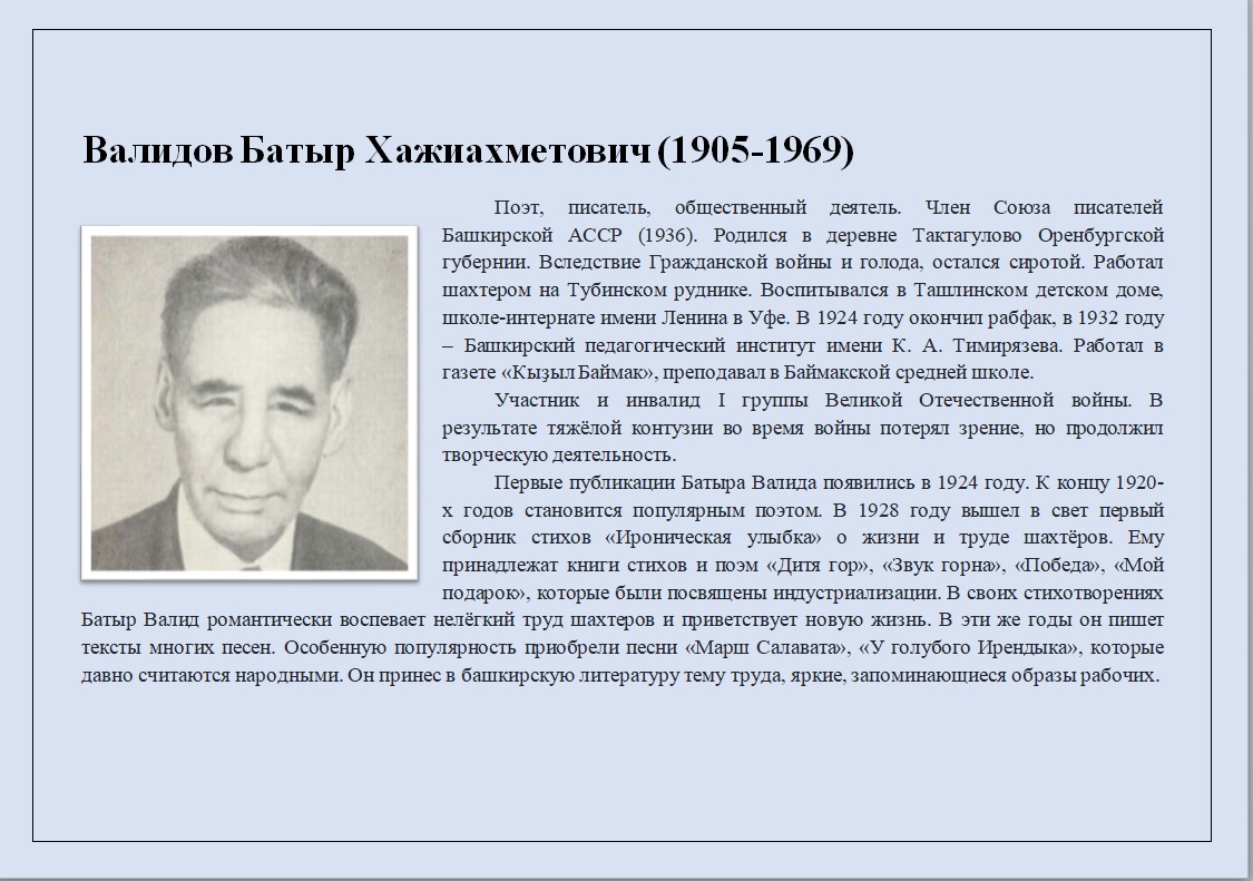 Сегодня мы предлагаем вашему вниманию виртуальную выставку, посвящённую башкирскому поэту и журналисту, члену Союза писателей Башкирской АССР Батыру Хажиахметовичу Валидову (творческий псевдоним Батыр Валид) (1905 – 1969).