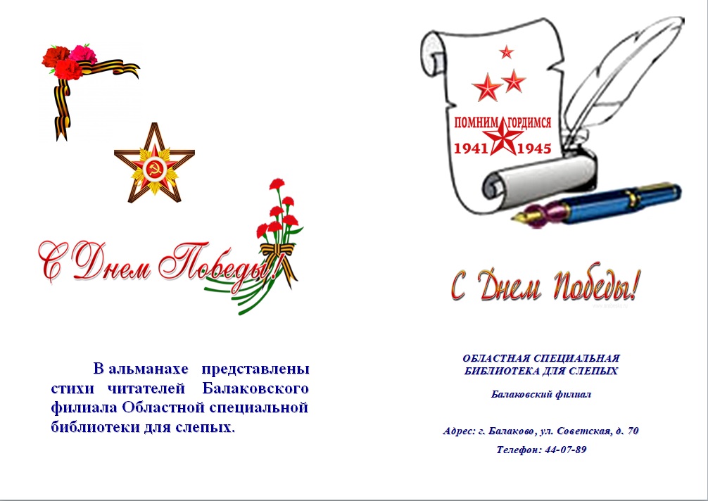 Балаковский филиал Областной специальной библиотеки для слепых посвятил подвигу нашего народа в грозные и тяжелые годы Великой Отечественной войны поэтический альманах. В альманахе «Мы помним!» представлено поэтическое творчество читателей Балаковского филиала, посвящённое 75-летию Великой Победы.