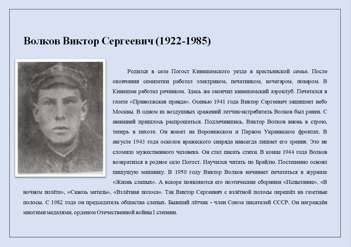 Предлагаем вашему вниманию виртуальную выставку, посвящённую поэту Виктору Сергеевичу Волкову (1922 – 1985).