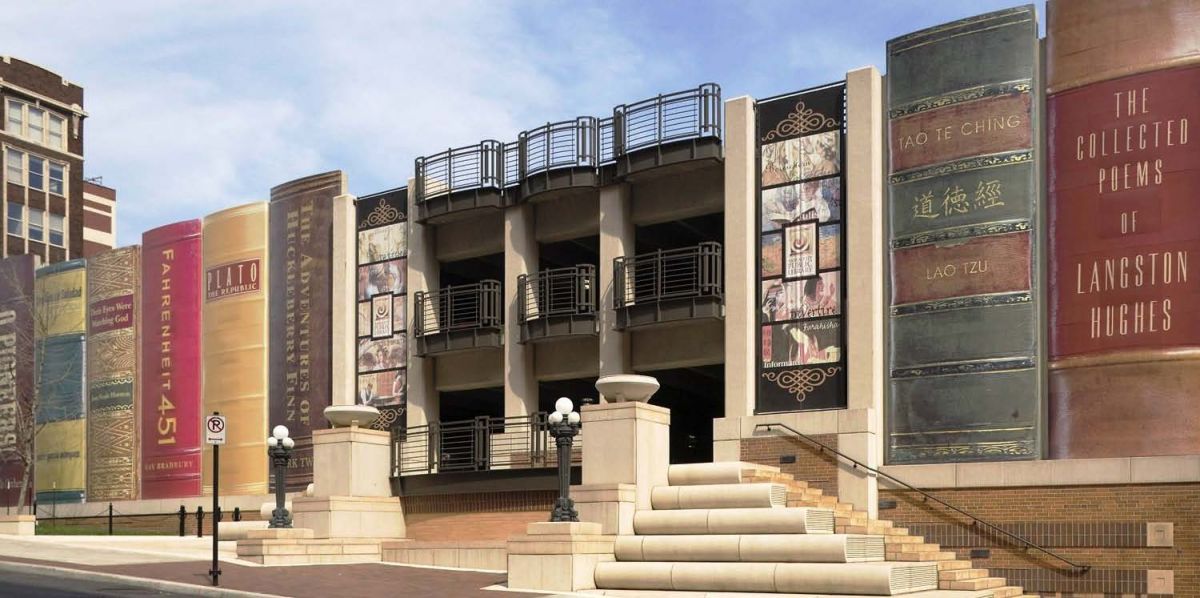 В 2004 году Публичная библиотека города Канзаса была перенесена в пустующее старое здание Первого национального банка. Через два года после переезда на новое местожительство библиотеки рядом построили парковку, нарушив архитектурный облик здания. Чтобы закрыть вид на парковку, было принято решение построить стену в виде гигантской книжной полки.