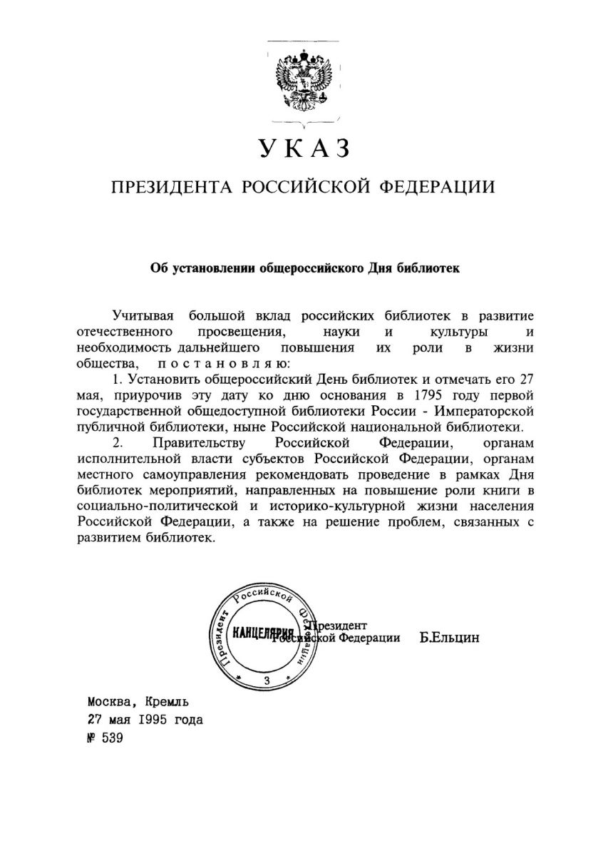 Этот праздник берет свое начало в 1995 году и установлен Президентом Российской Федерации Б.Н. Ельциным. Именно первым президентом Российской Федерации в 1995 году был издан Указ № 539 «Об установлении общероссийского дня библиотек».