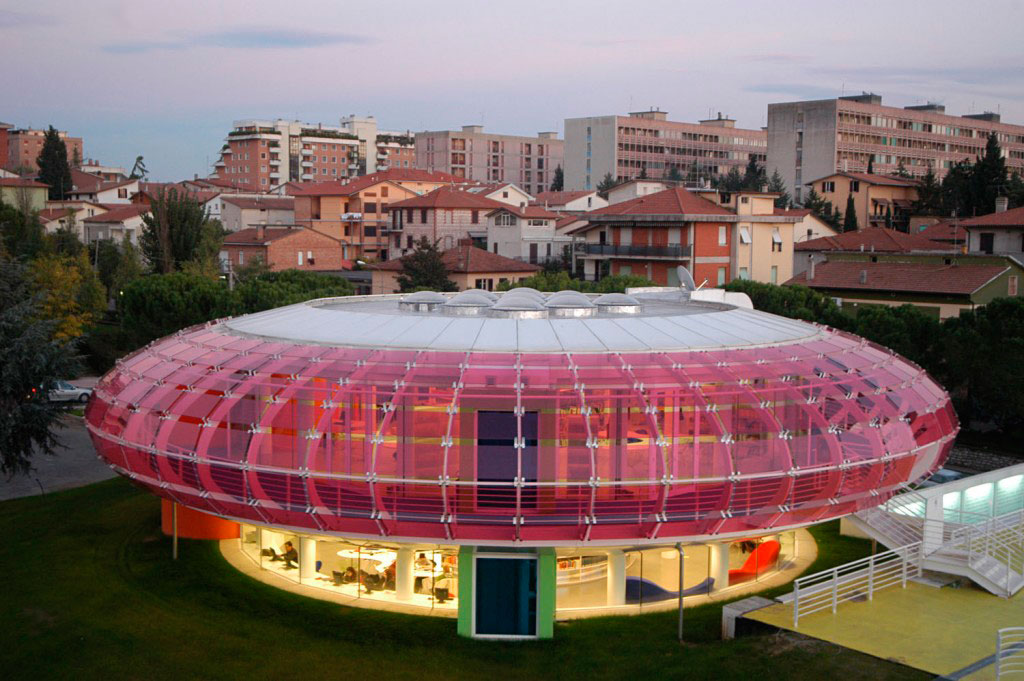 «К нам прилетел НЛО!» – первая мысль, которая может посетить туриста в Перудже, когда он видит перед собой библиотеку имени Сандро Пенны. Здание библиотеки выполнено в форме летающей тарелки с прозрачными розовыми стенами.