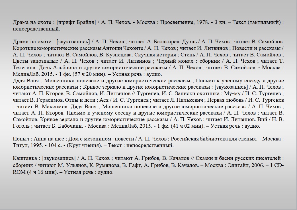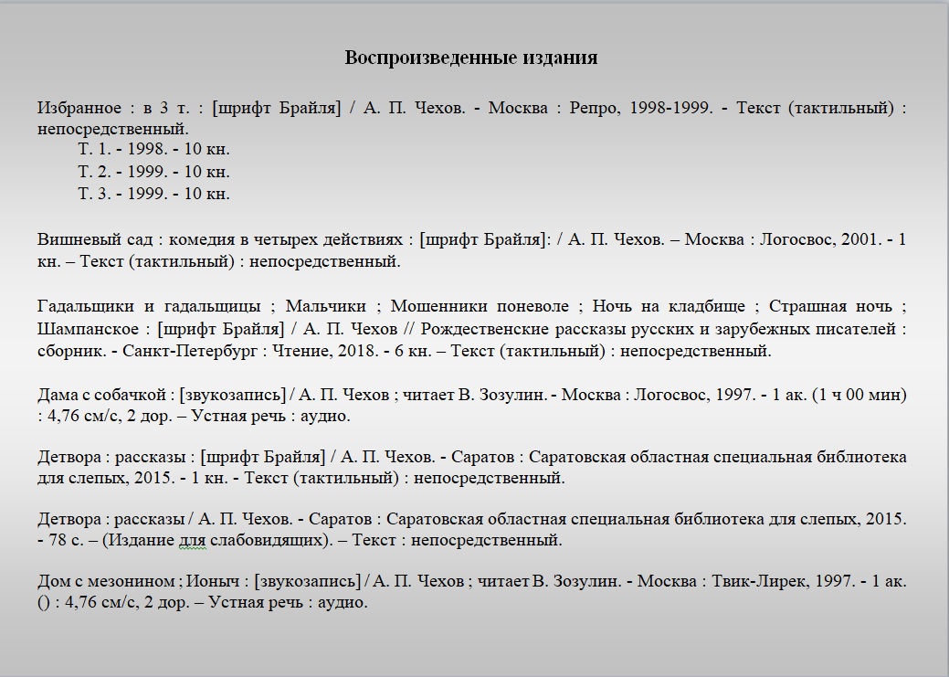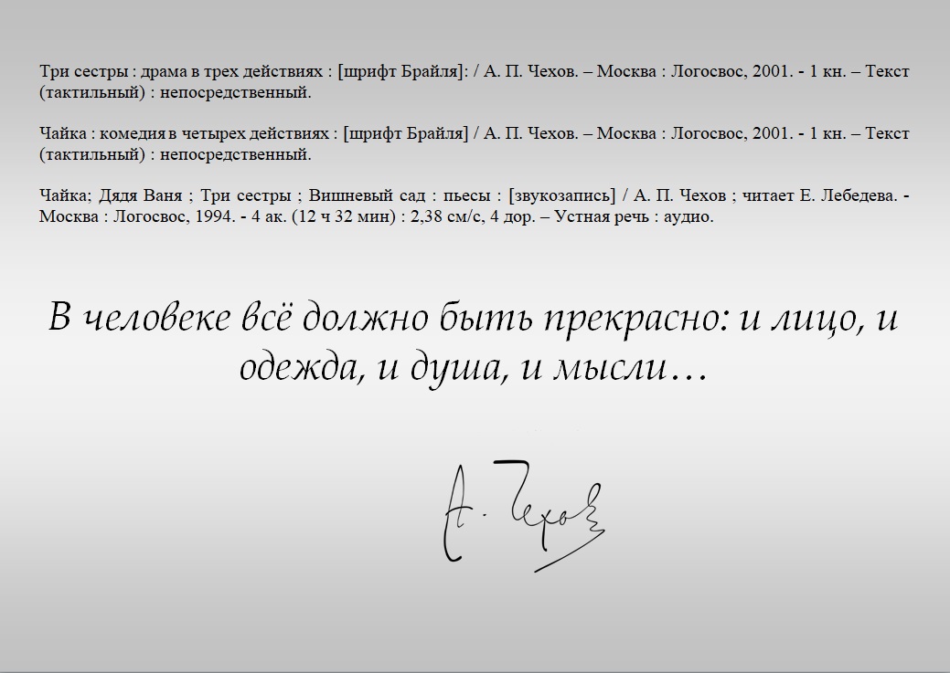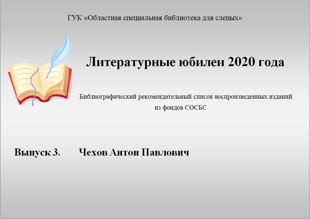 В 2020 году исполнилось 160 лет со дня рождения писателя, классика русской литературы Антона Павловича Чехова (1860 – 1904). К юбилею писателя сотрудники Областной специальной библиотеки для слепых подготовили библиографический рекомендательный список воспроизведенных изданий А.П. Чехова из фондов библиотеки.