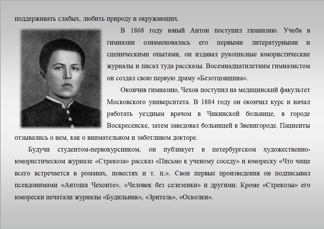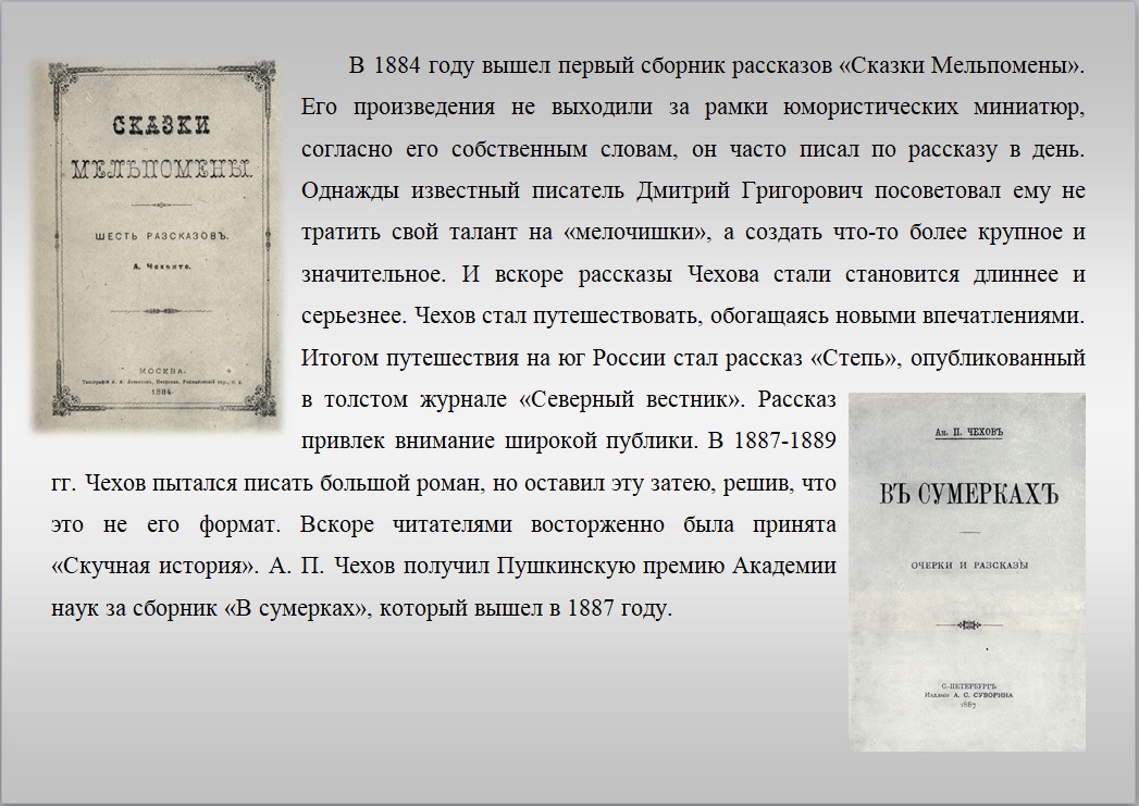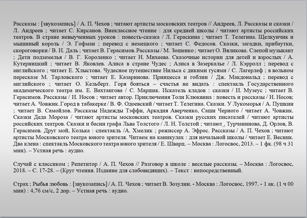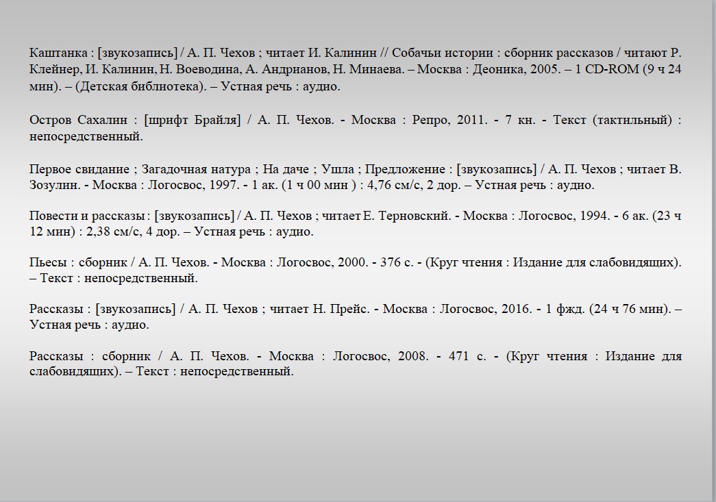 В 2020 году исполнилось 160 лет со дня рождения писателя, классика русской литературы Антона Павловича Чехова (1860 – 1904). К юбилею писателя сотрудники Областной специальной библиотеки для слепых подготовили библиографический рекомендательный список воспроизведенных изданий А.П. Чехова из фондов библиотеки.