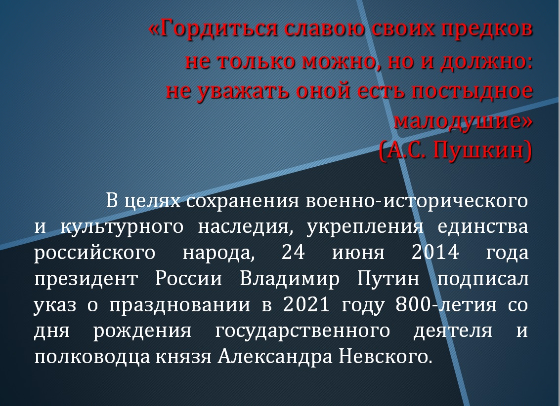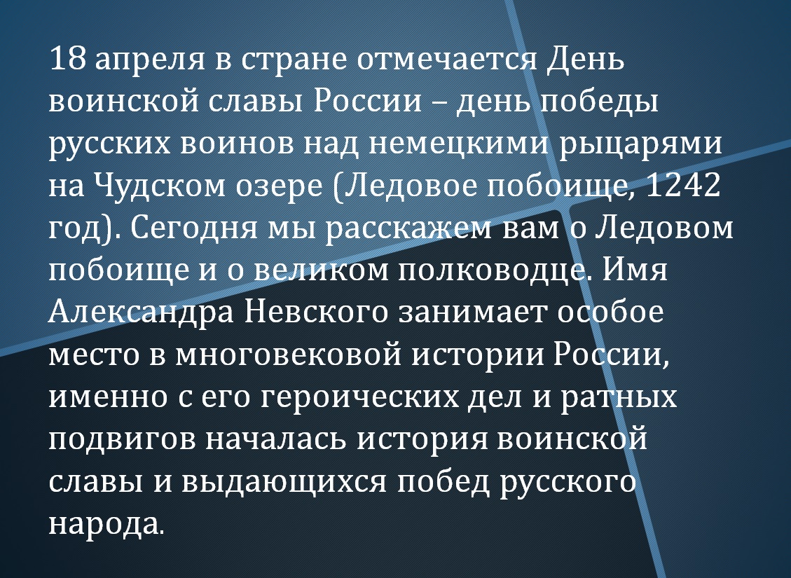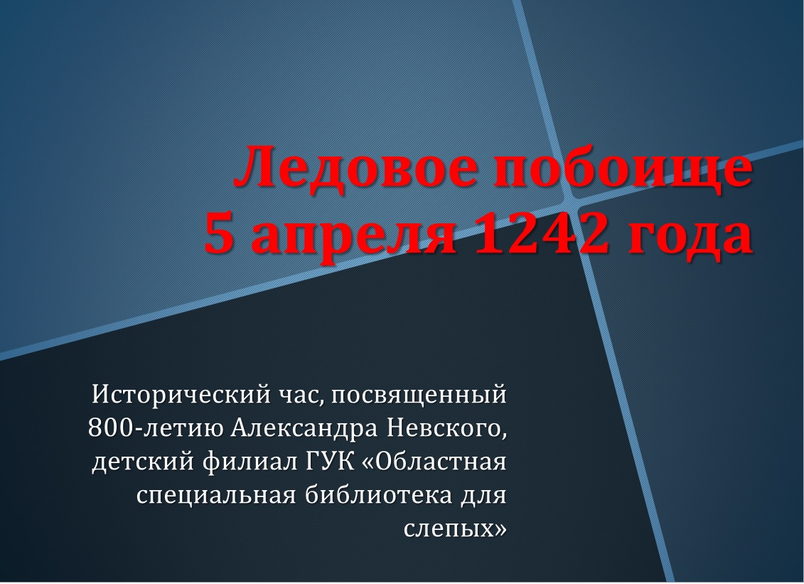 18 апреля в стране отмечается День воинской славы России – день победы русских воинов над немецкими рыцарями на Чудском озере (Ледовое побоище, 1242 год). Сегодня Детский филиал Областной специальной библиотеки для слепых предлагает вашему вниманию исторический час – рассказ о Ледовом побоище и о великом полководце. Читатели узнают, что имя Александра Невского занимает особое место в многовековой истории России, что с его героических дел и ратных подвигов началась история воинской славы и выдающихся побед русского народа. Эта встреча проходит в рамках мероприятий Областной специальной библиотеки для слепых, посвящённых 800-летию Александра Невского.