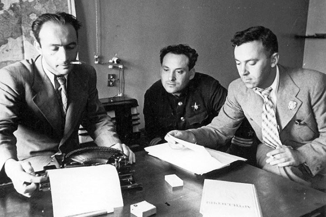 Юрий Герман, Иоганн Зельцер и Александр Штейн в работе над сценарием фильма «Один из многих»