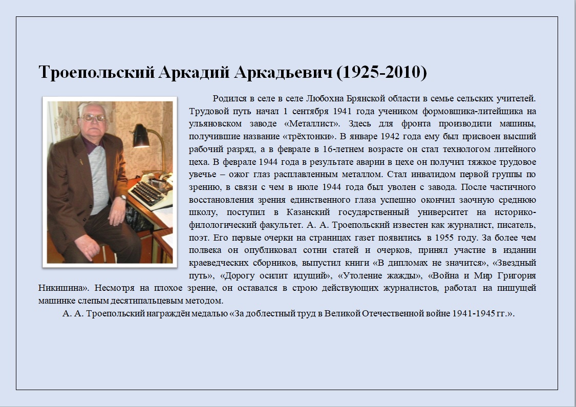 Цикл виртуальных выставок «Писатели и поэты-фронтовики, потерявшие зрение». Троепольский Аркадий Аркадьевич (1925-2010)