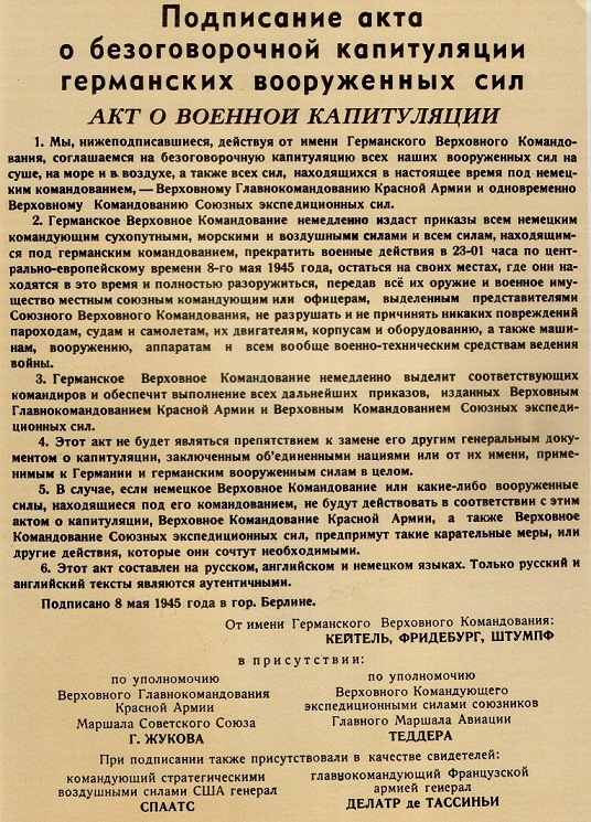 Великая Отечественная война явилась составной частью и главным содержанием всей Второй мировой войны, в которую было вовлечено более 60 государств. В тяжелой кровопролитной войне советский народ внес решающий вклад в освобождение народов Европы от фашистского господства и в разгром гитлеровских войск. 8 мая 1945 года был подписан окончательный Акт о безоговорочной капитуляции фашистской Германии и ее вооруженных сил.