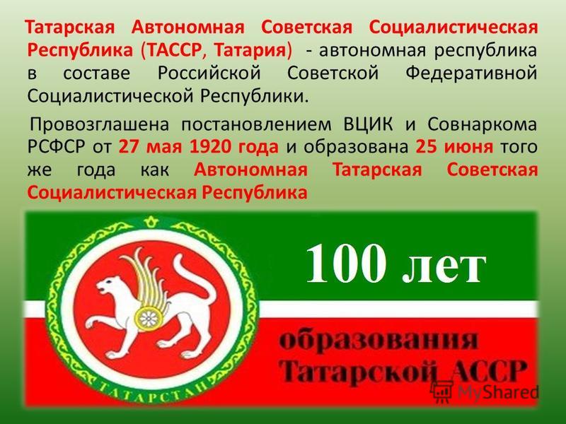 В 2020 году исполняется 100 лет (1920-2020) со дня образования Татарской Автономной Советской Социалистической Республики – ТАССР.