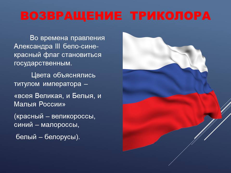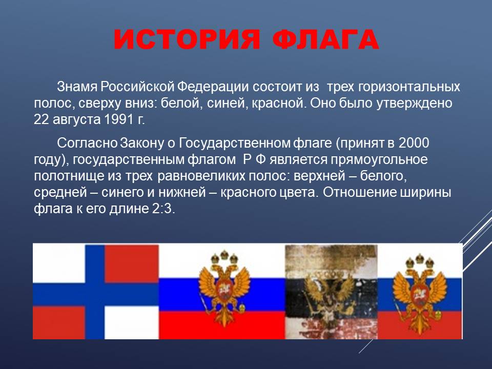 День Государственного флага Российской Федерации – это праздник всех поколений россиян, дань уважения истории великой страны. Трёхцветный стяг неразрывно связан со становлением Российского государства, он стал символом военных побед и достижений. Этот праздник вызывает в нас чувство гордости за свою великую страну, за наших соотечественников.