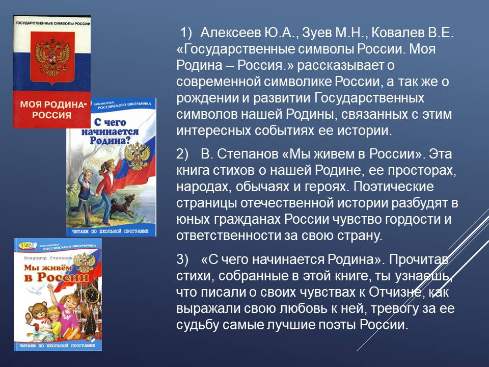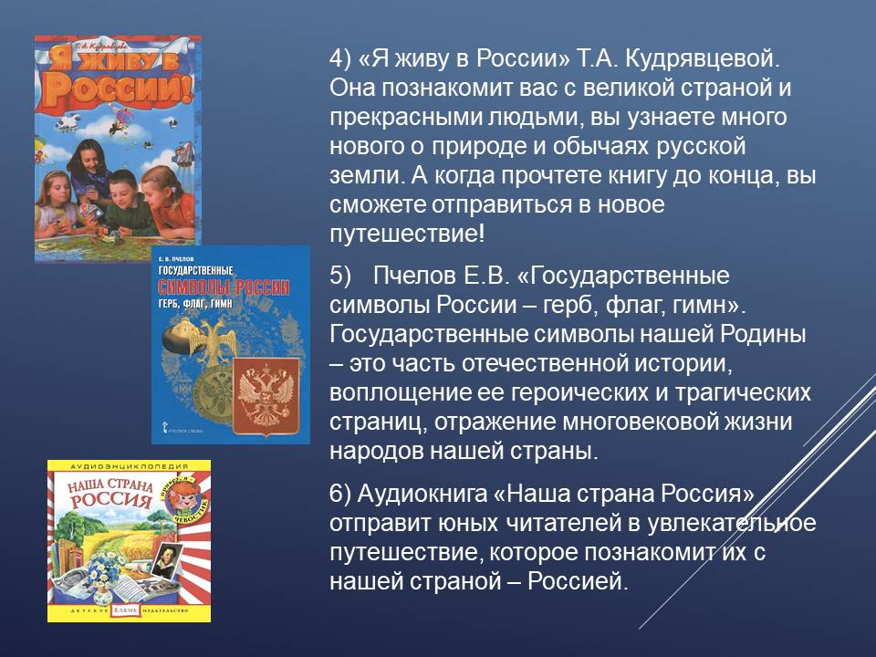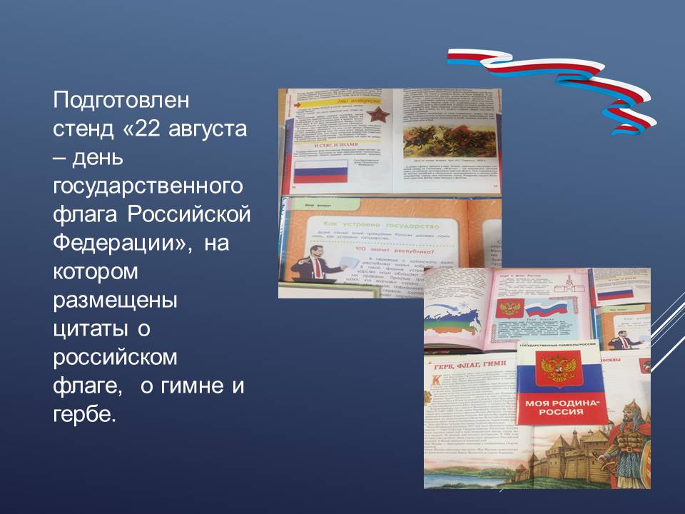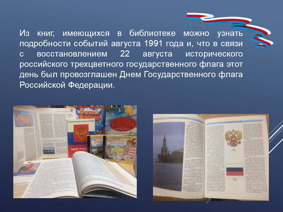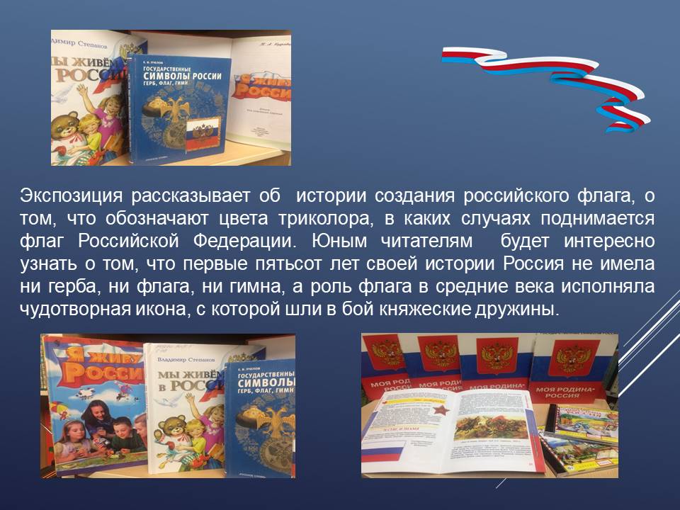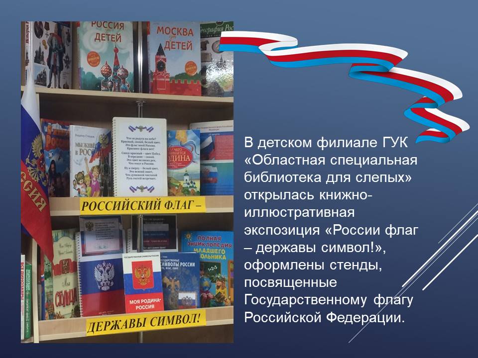 С 17 августа в Детском филиале ГУК «Областная специальная библиотека для слепых» оформлена книжно-иллюстративная экспозиция «России флаг – державы символ!», главной идеей которого является формирования чувства уважения и гордости молодого поколения к своей Родине. Юные читатели познакомятся с тремя символами государства: флаг, герб и гимн. Узнают интересные факты из истории появления российского флага, о том, что символизирует каждый его цвет, на каких зданиях он должен быть, при каких обстоятельствах его торжественно поднимают, почему у каждого государства есть свой флаг.