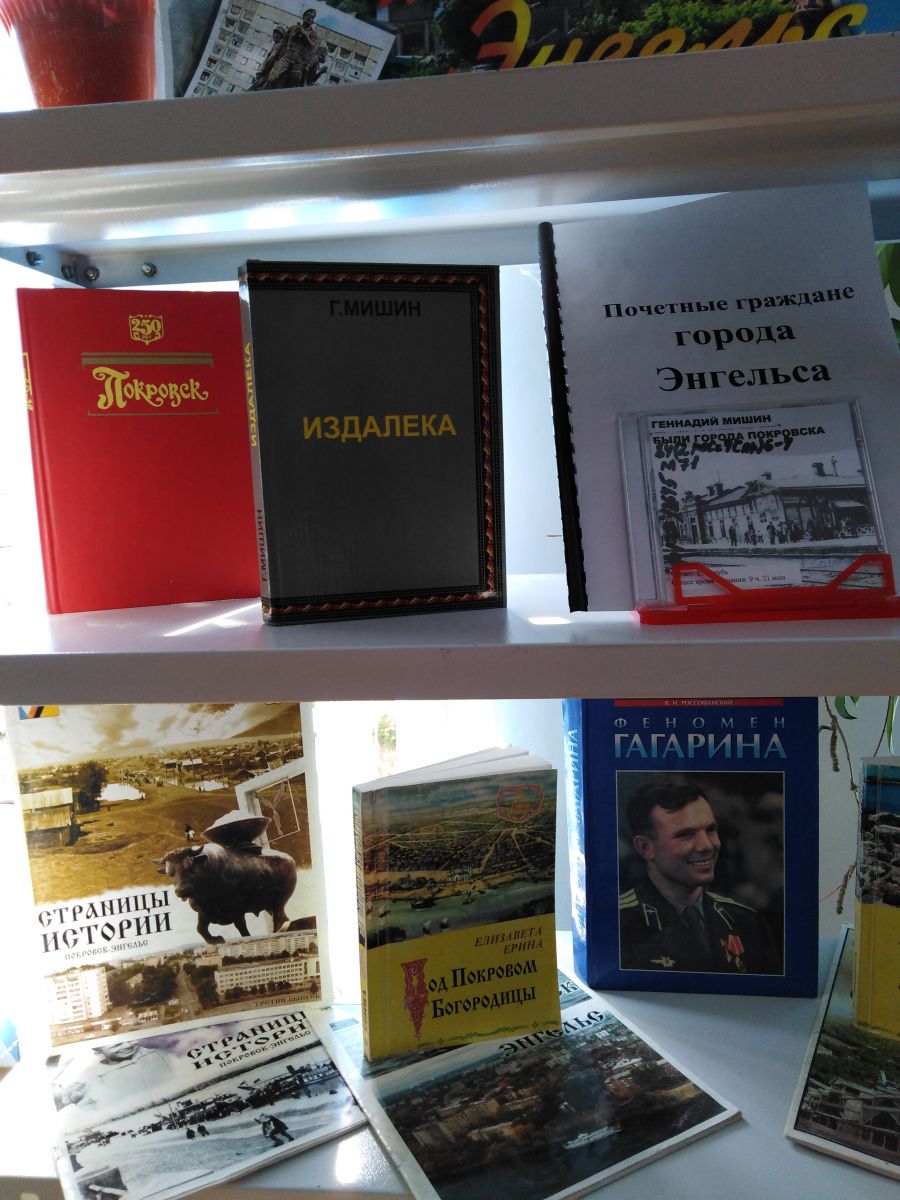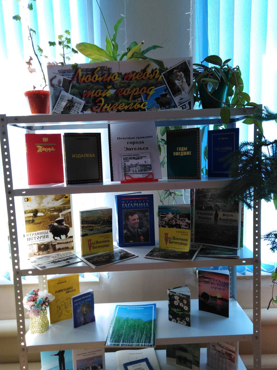 Четвертый раздел «Люблю тебя мой город Энгельс» представлен полочной выставкой, состоящей из книг о нашем городе. Это книги Геннадия Мишина – «Издалека» и «Годы ушедшие», краеведа Елизаветы Ериной «Под Покровом Богородицы», стихи энгельсских авторов – Людмилы Ильиной, Александра Кобылинского, Галины Никитиной.