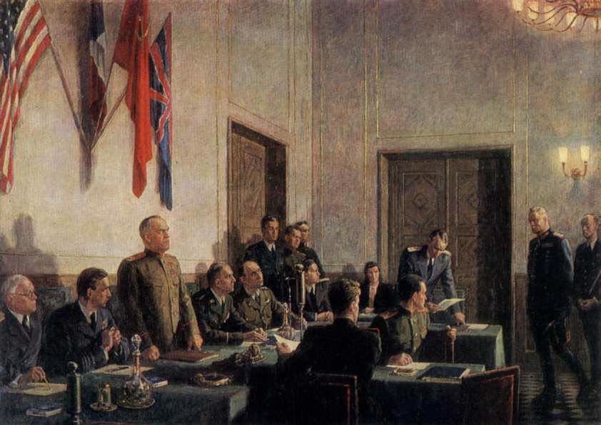 Тогда советские войска окружили Берлин, перед военным руководством Третьего рейха встал вопрос о сохранении остатков Германии. Это было возможным, лишь избежав безоговорочной капитуляции. Тогда было принято решение капитулировать только перед англо-американскими войсками, но продолжать боевые действия против Красной Армии. Однако Советский Союз выдвигал требование безоговорочной капитуляции как единственного условия окончания войны. По настоянию руководства СССР, представители союзников повторно собрались уже в Берлине и совместно с советской стороной 8 мая 1945 года подписали еще один Акт о безоговорочной капитуляции фашистской Германии и её вооруженных сил. Стороны условились, что первый акт будет именоваться предварительным, а второй - окончательным.