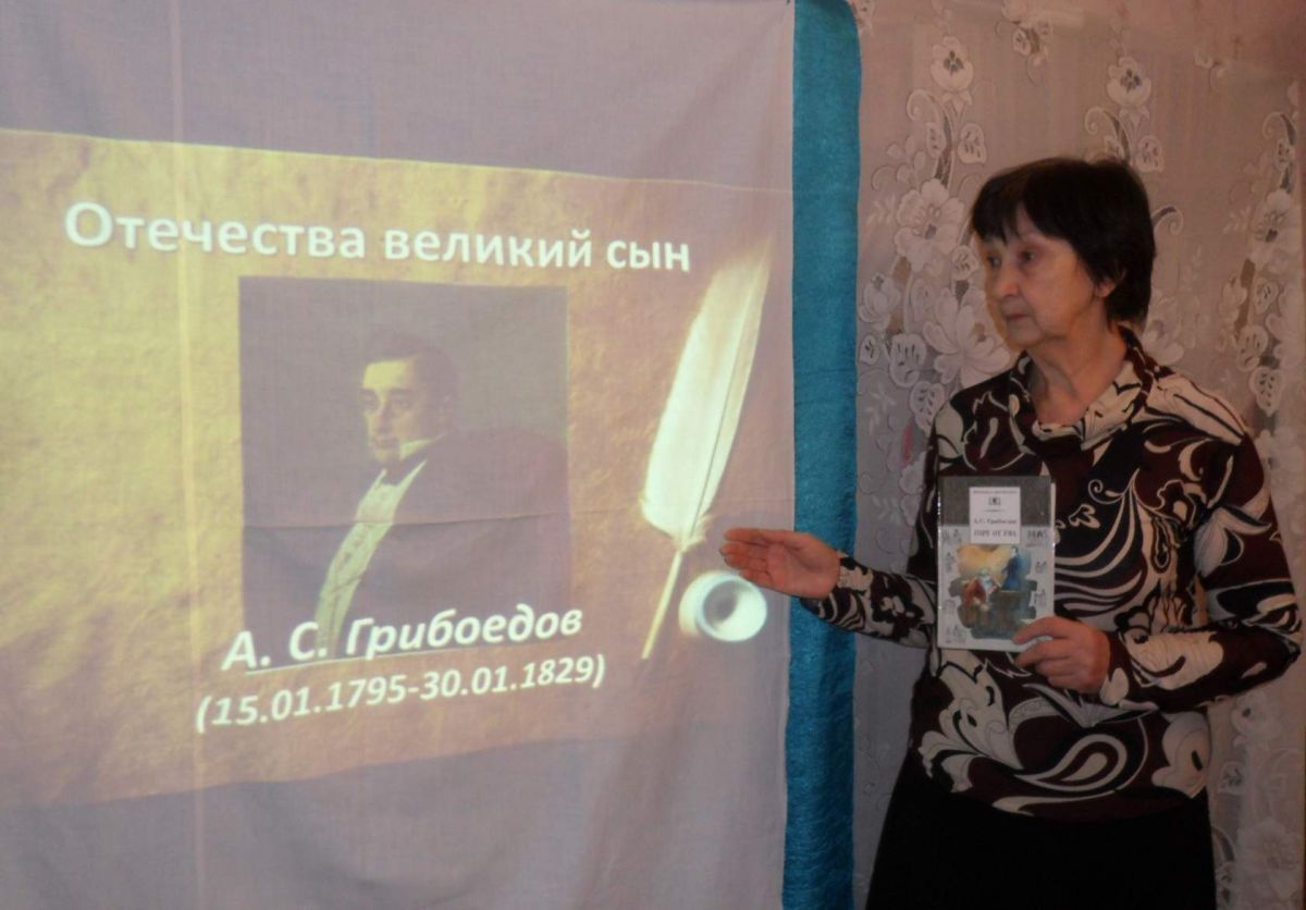 Совместно с заведующей Пугачевской районной межпоселенческой библиотекой О.В. Лопаткиной познакомили читателей с интересной информацией о жизни и творчестве А.С. Грибоедова, о романтической истории любви с его женой Ниной Чавчавадзе,а также о роли Грибоедова в истории России. В ходе мероприятия прозвучал вальс, написанный писателем. Присутствующие вспомнили крылатые выражения из бессмертной комедии Грибоедова. В библиотеке развёрнута книжная выставка к 225-летию со дня рождения А.С. Грибоедова.