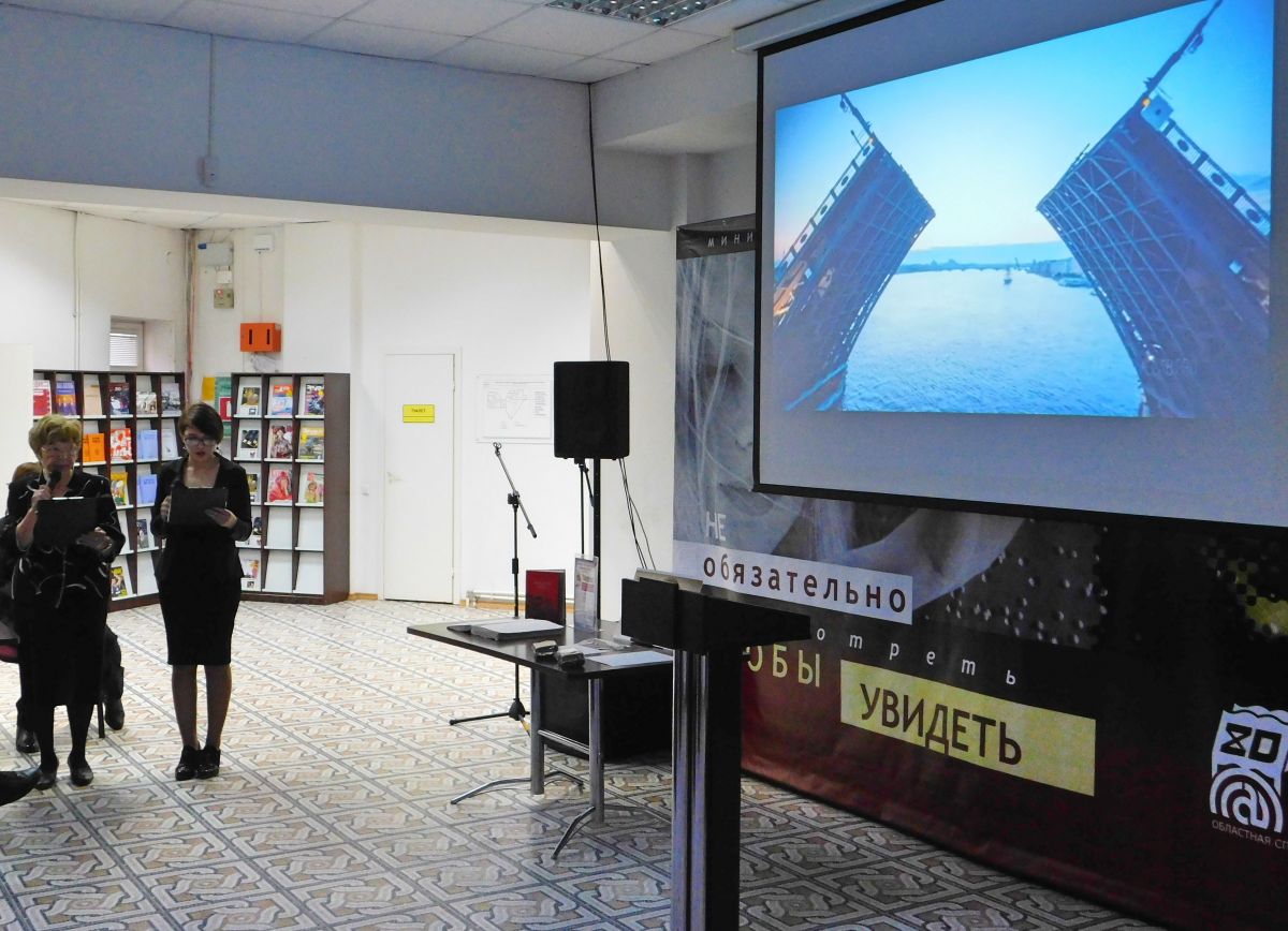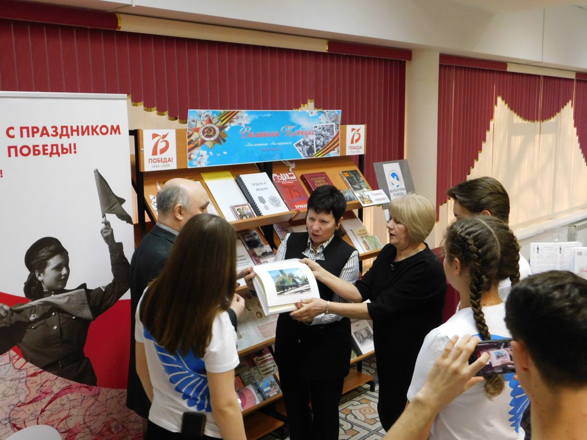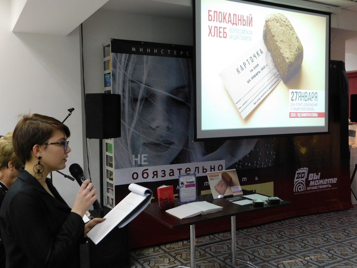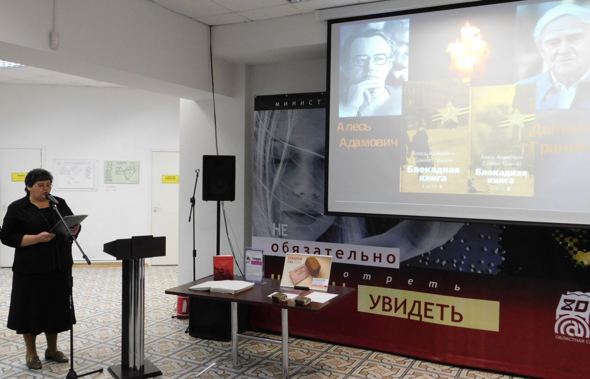 Заведующая отделом обслуживания Марина Мартынова провела обзор книжной выставки на специальных носителях «По страницам одной книги», посвящённой «Блокадной книге» Алеся Адамовича и Даниила Гранина. Сотрудник библиотеки Валентина Шохина прочитала вслух отдельные главы из «Блокадной книги».
