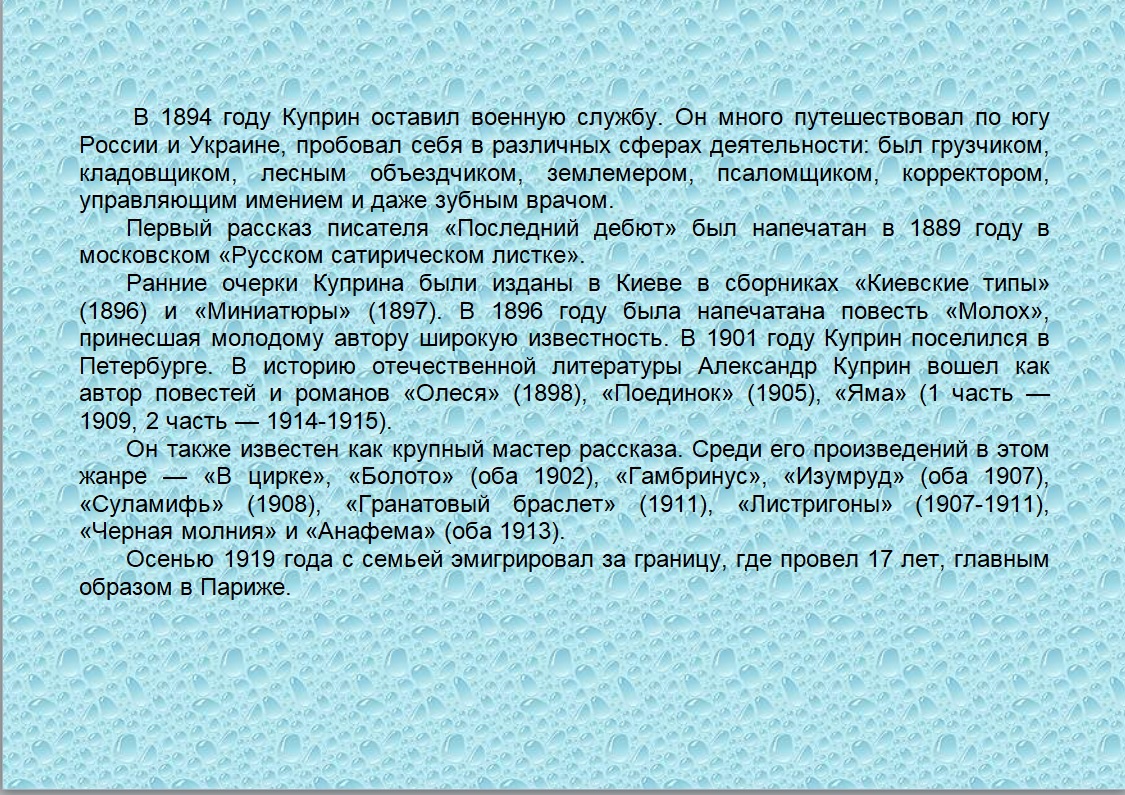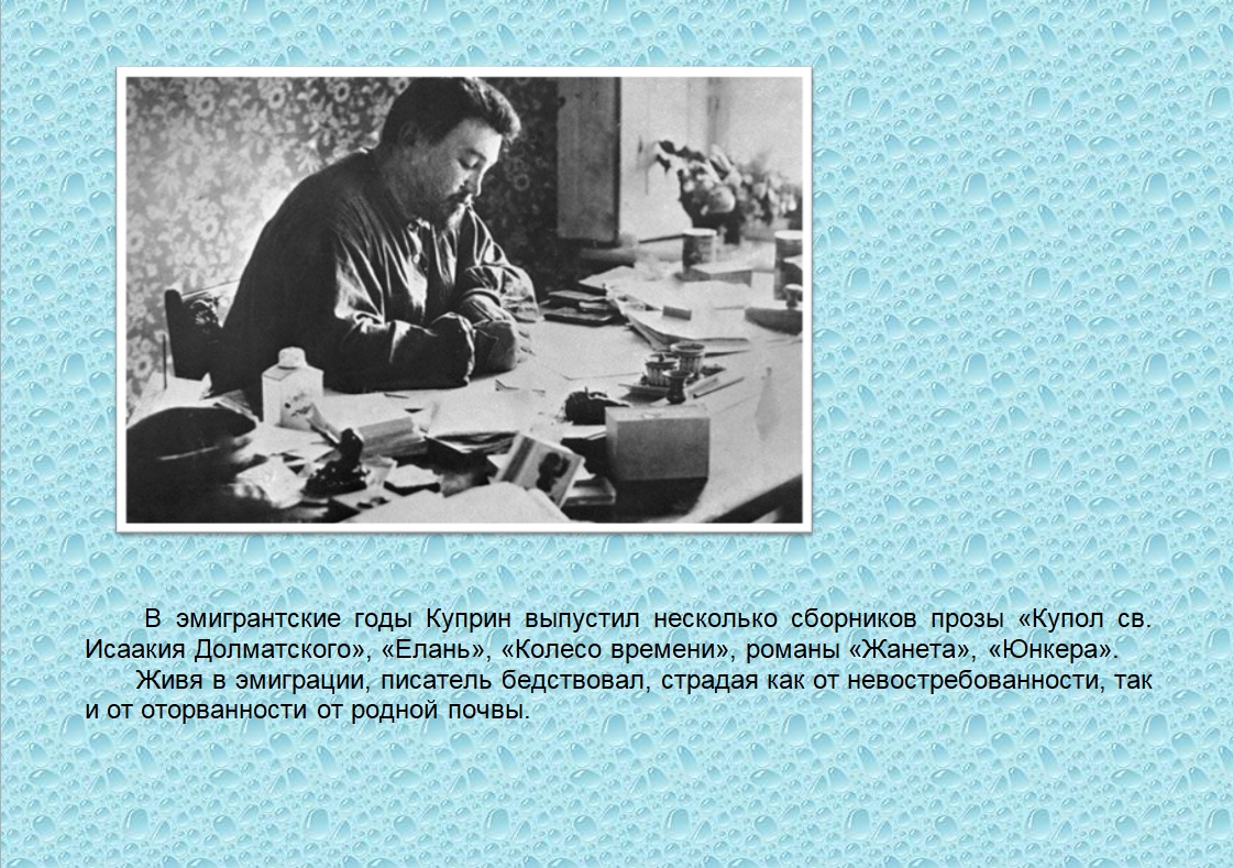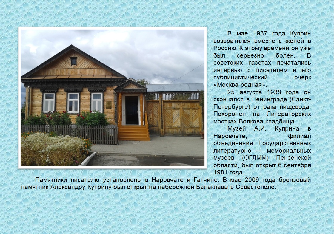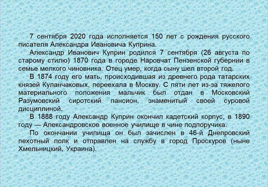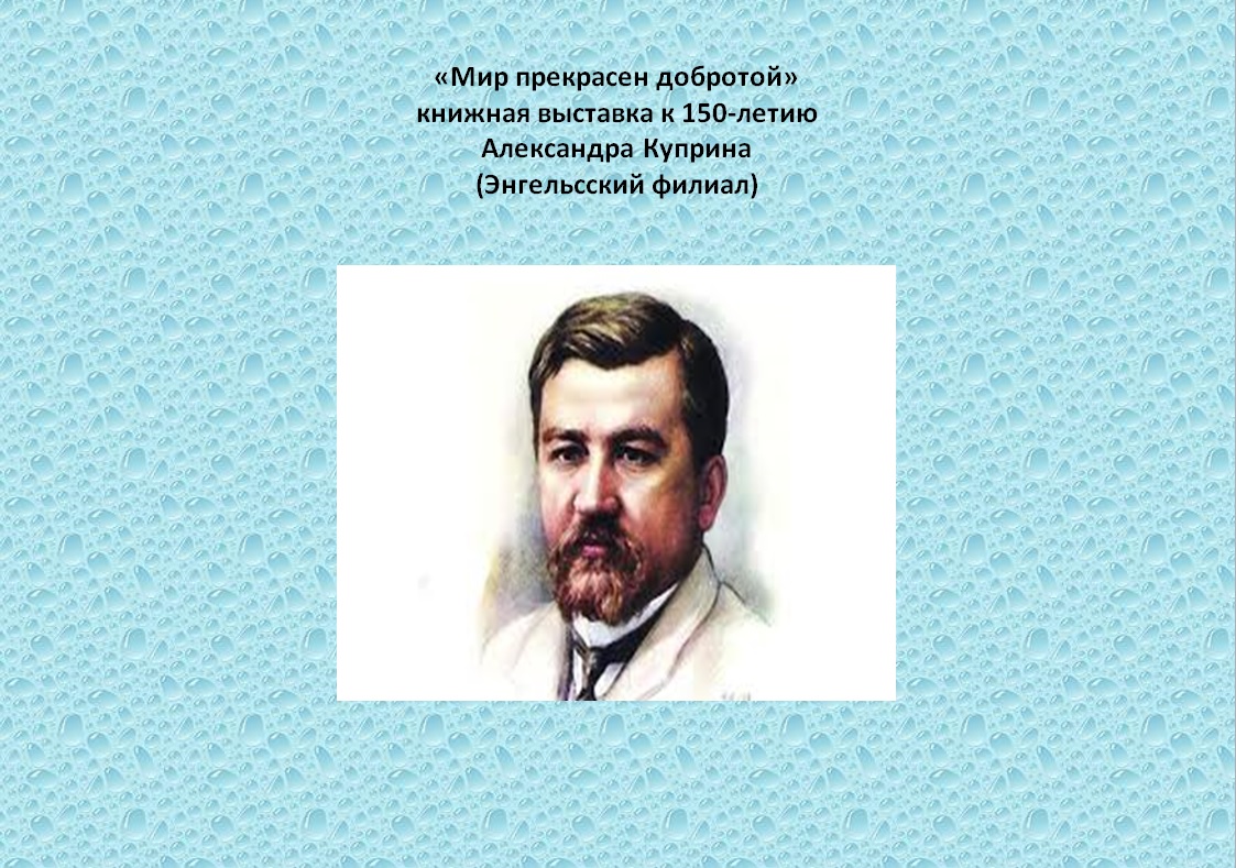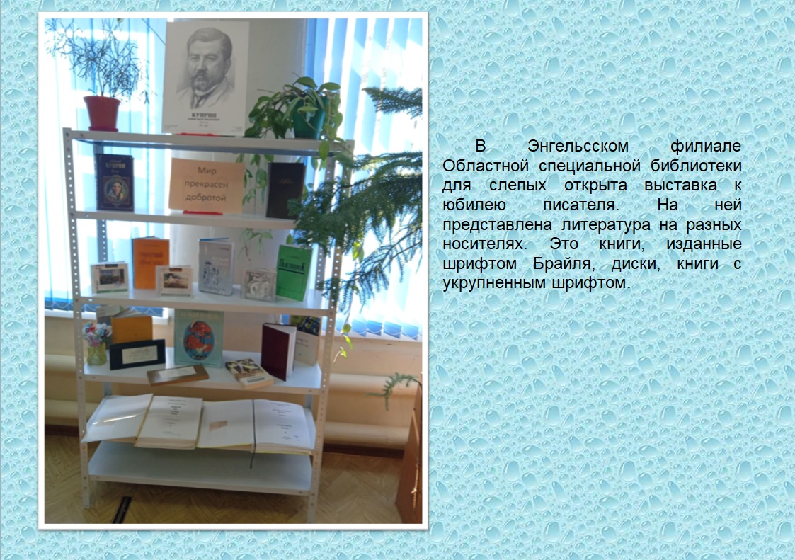 7 сентября 2020 года исполняется 150 лет с рождения русского писателя Александра Ивановича Куприна. Энгельсский филиал Областной специальной библиотеки для слепых подготовил книжную выставку, посвящённую юбилею писателя.