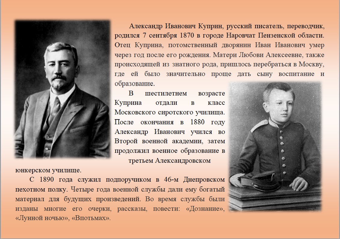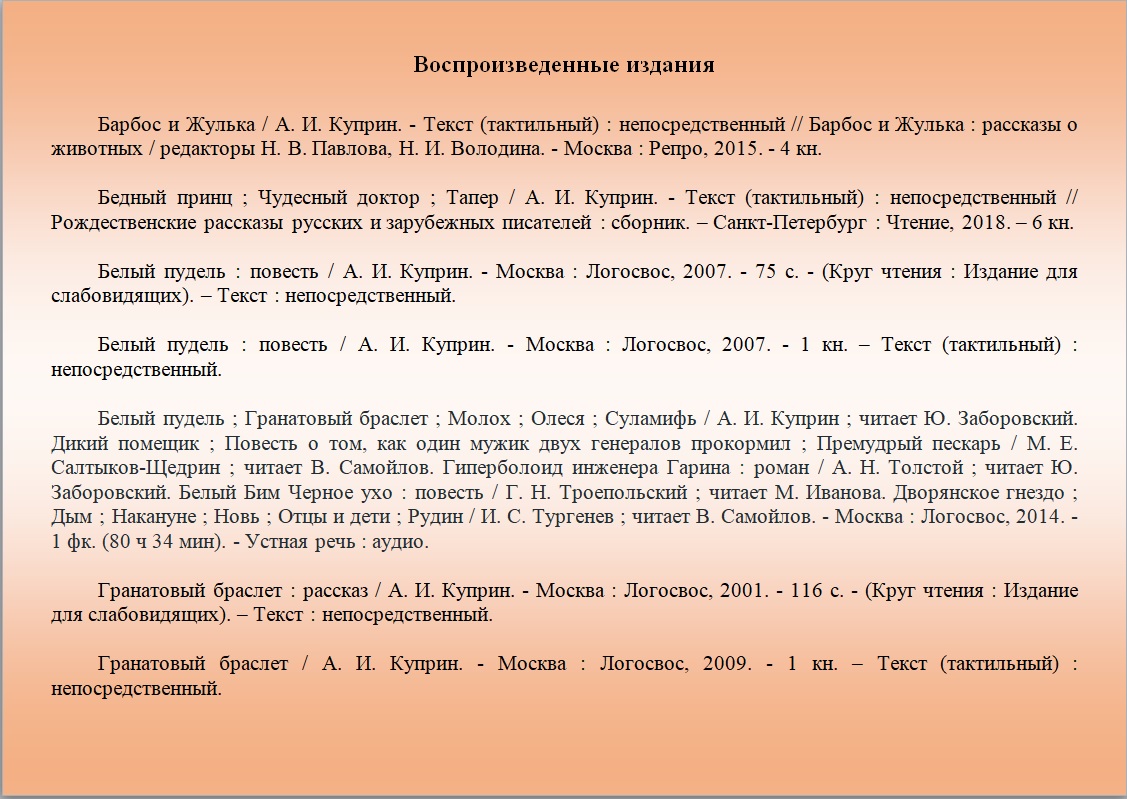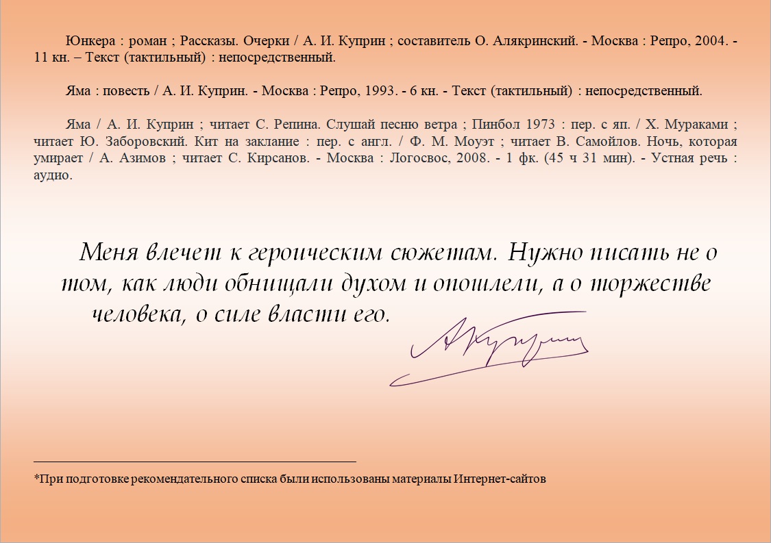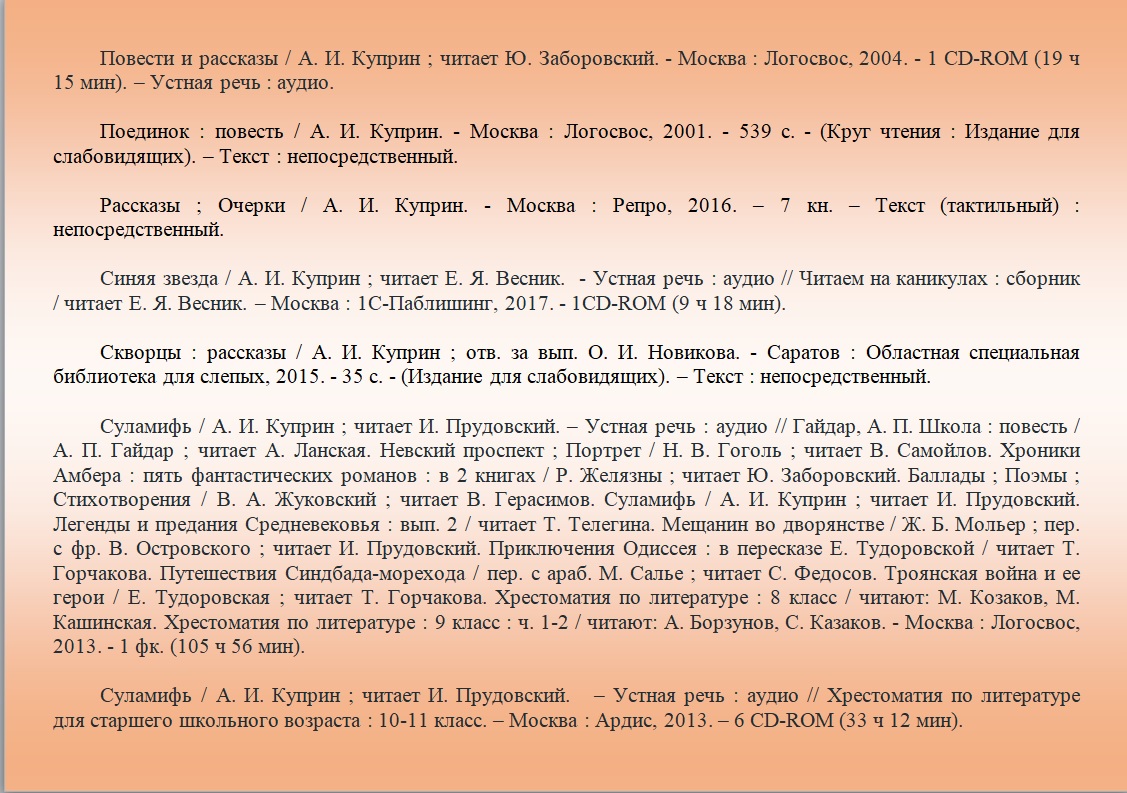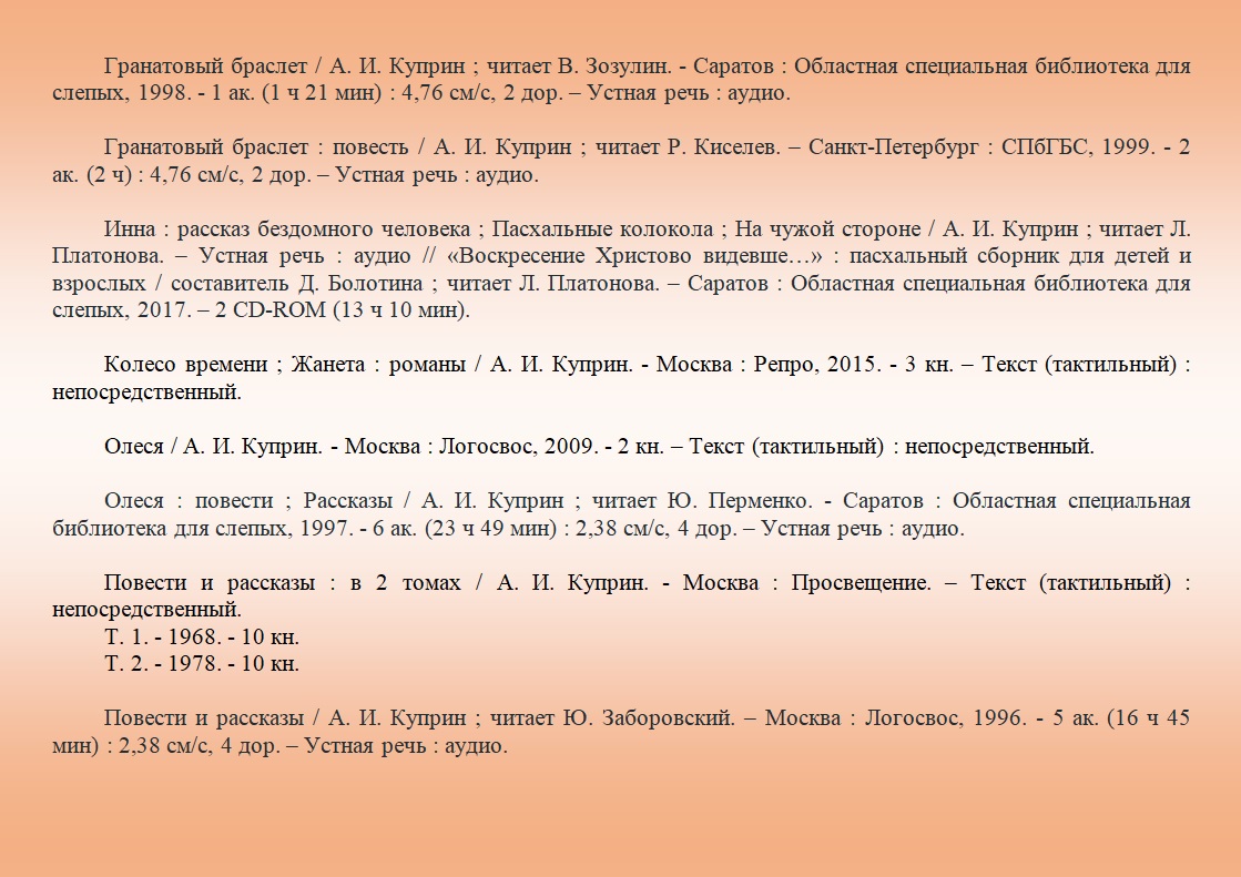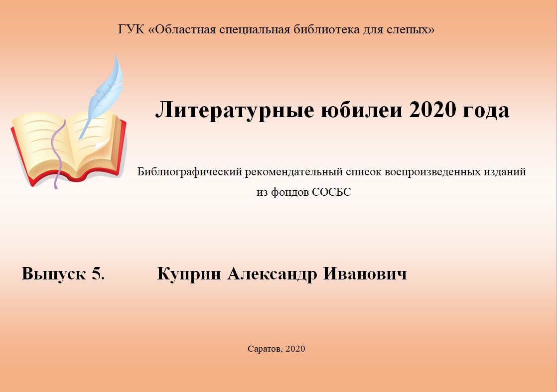 Предлагаем вашему вниманию библиографический рекомендательный список воспроизведенных изданий из фондов Областной специальной библиотеки для слепых, посвящённый 150-летию со дня рождения писателя Александра Ивановича Куприна (1870 - 1938).