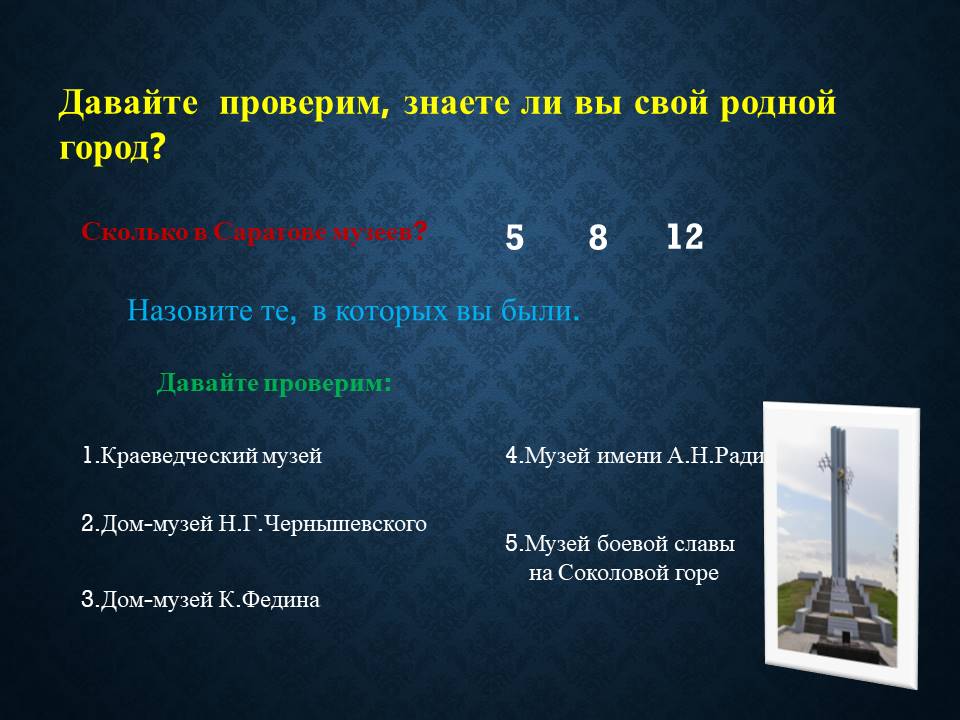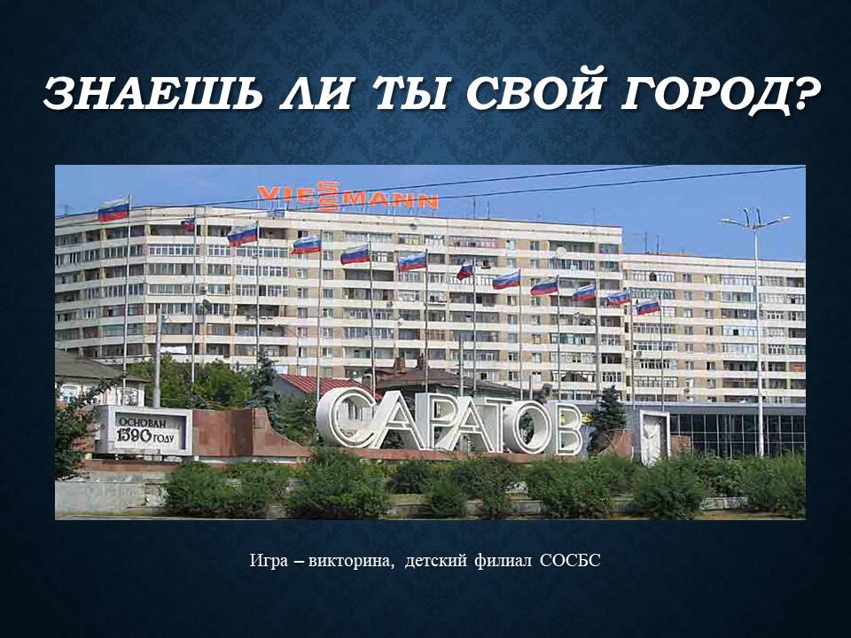 Детский филиал Областной специальной библиотеки для слепых предлагает вашему вниманию игру-викторину, посвящённую празднованию 430-летия города Саратова, во время которой читатели совершат виртуальное путешествие по Саратову. Викторина поможет детям обогатить свои знания, пополнить копилку интересной информацией о своей малой Родине. Еще раз вспомнить об истории возникновения и основателях города. Ребятам предстоит узнать много интересного и поделиться впечатлениями о достопримечательностях, о тех местах, где они побывали, и о том, что хотелось бы ещё увидеть.