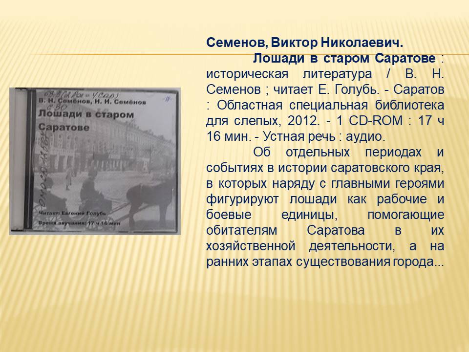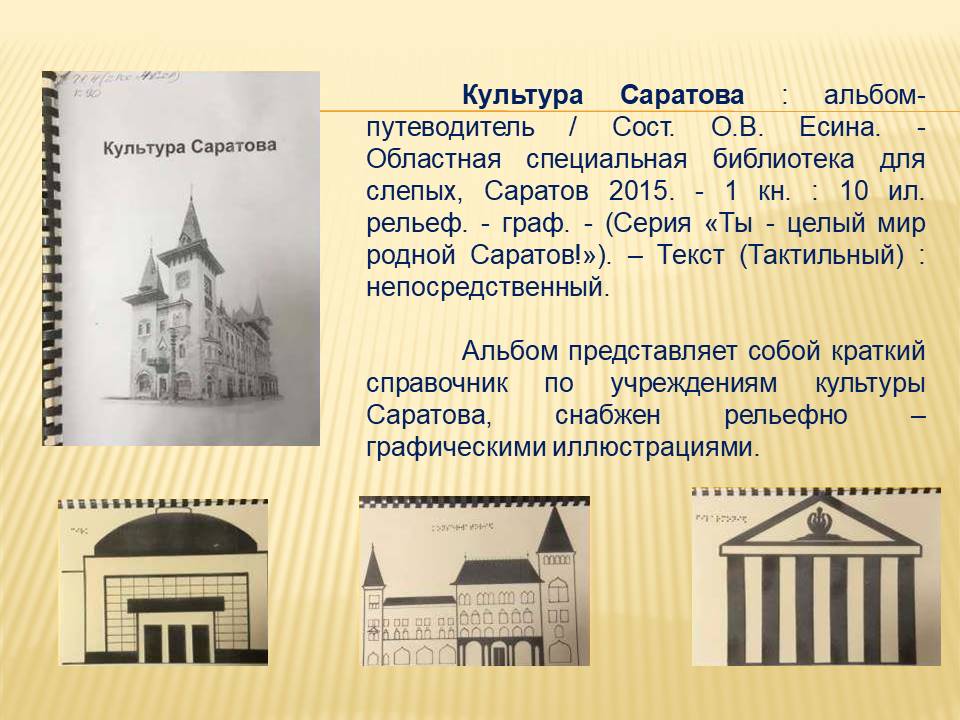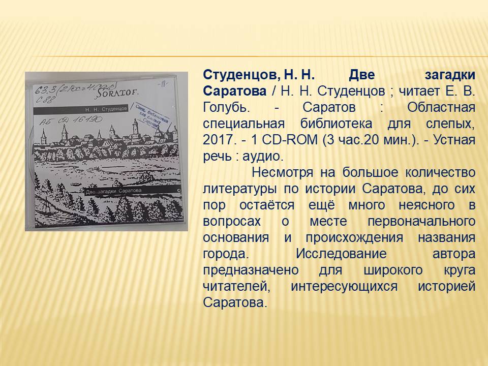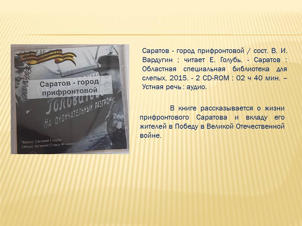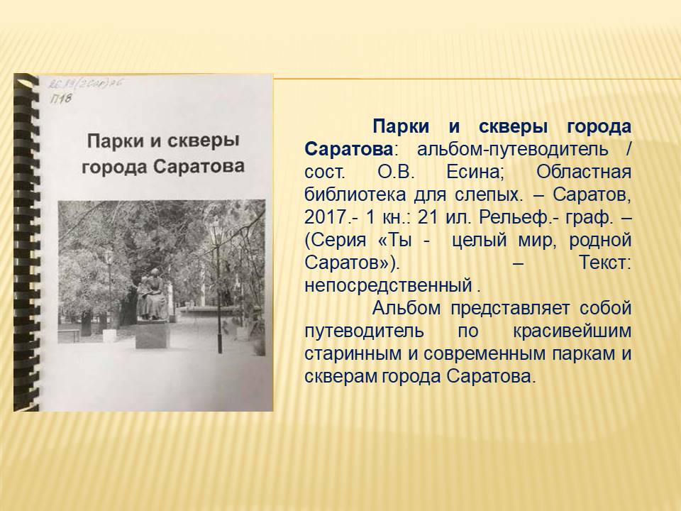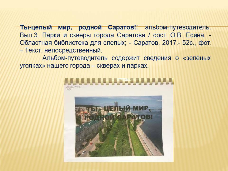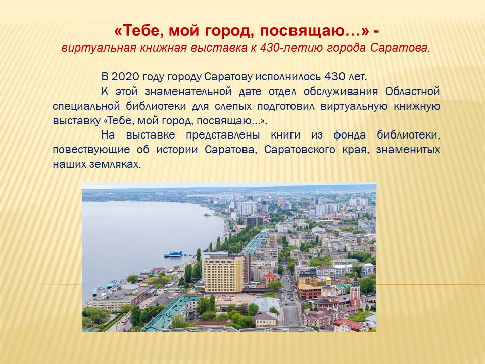 В 2020 году городу Саратову исполнилось 430 лет. К этой знаменательной дате отдел обслуживания Областной специальной библиотеки для слепых подготовил виртуальную книжную выставку «Тебе, мой город, посвящаю…». На выставке представлены книги из фонда библиотеки, повествующие об истории Саратова, Саратовского края, знаменитых наших земляках.
