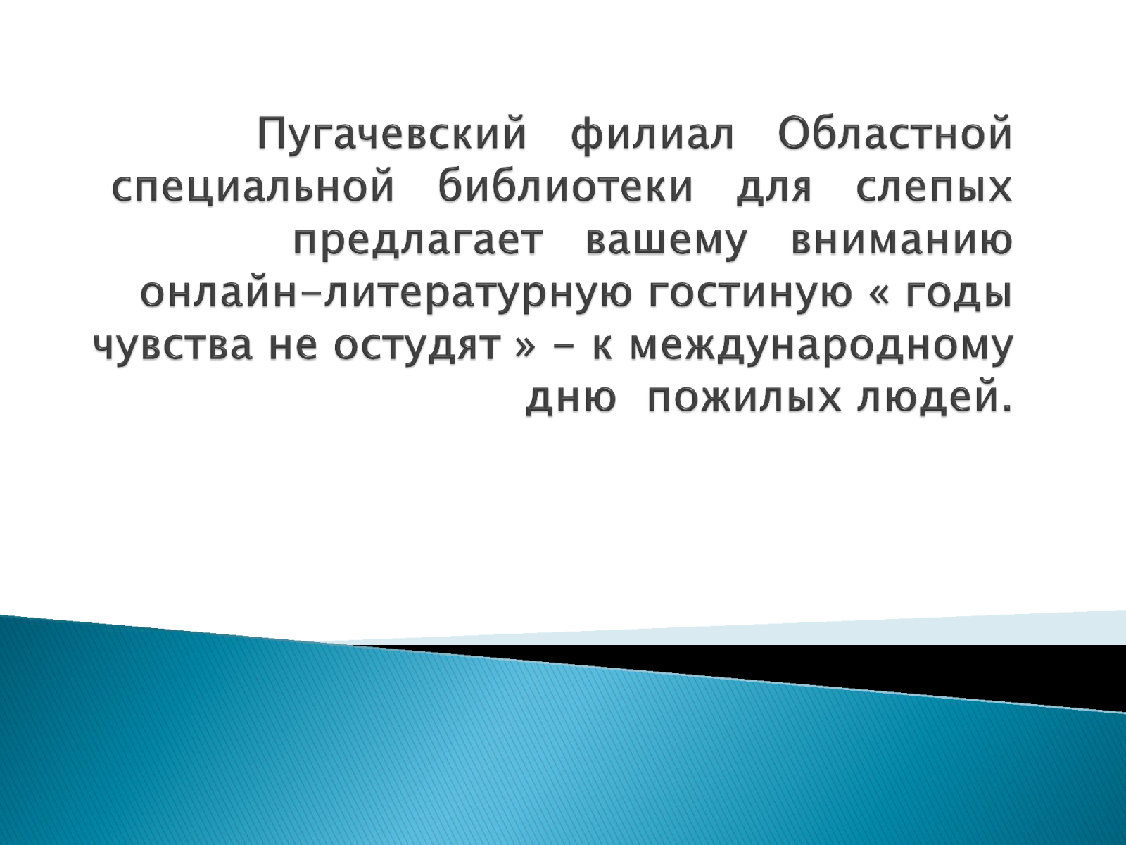 Пугачевский филиал Областной специальной библиотеки для слепых предлагает вашему вниманию онлайн-литературную гостиную «Годы чувства не остудят» к Международному дню пожилых людей.