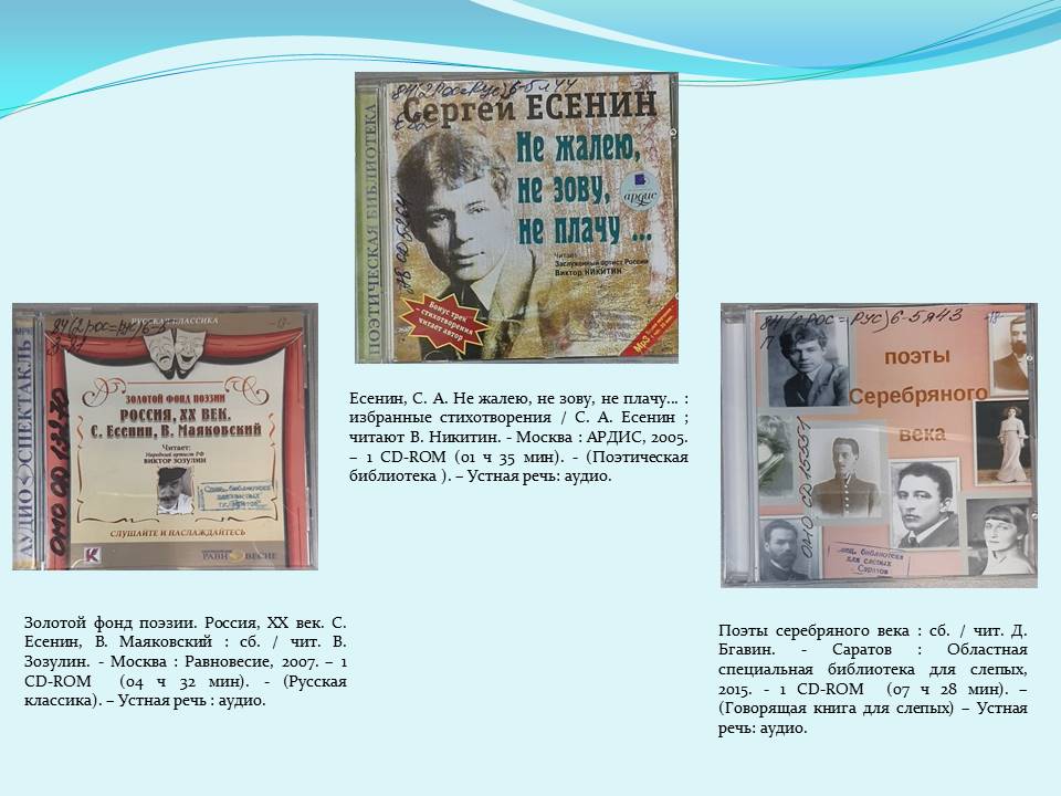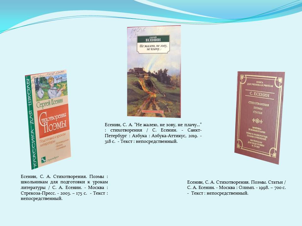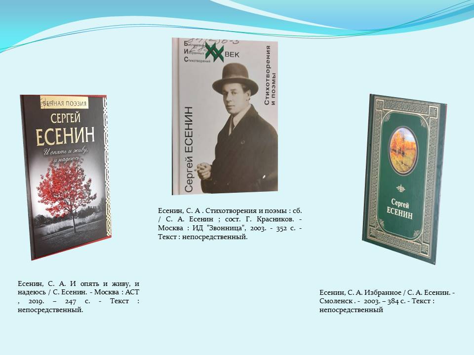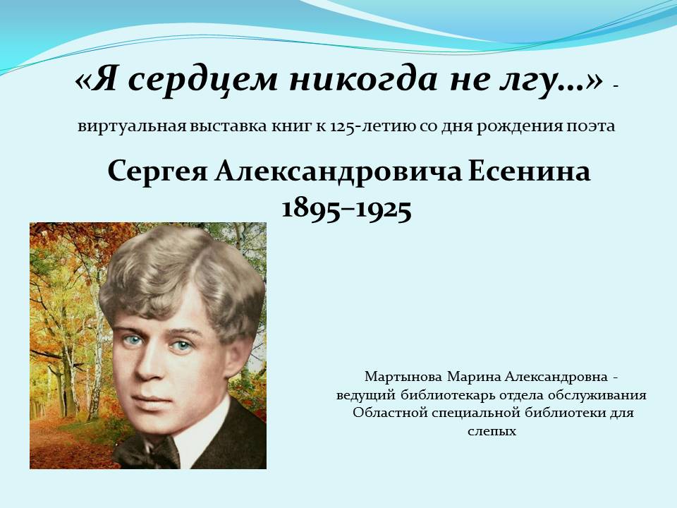 3 октября исполняется 125 лет со дня рождения Сергея Александровича Есенина. Тончайший лирик, волшебник русского пейзажа. С. Есенин стал воистину народным поэтом. Сотрудники отдела обслуживания (Детский парк) подготовили виртуальную выставку «Я сердцем никогда не лгу…»