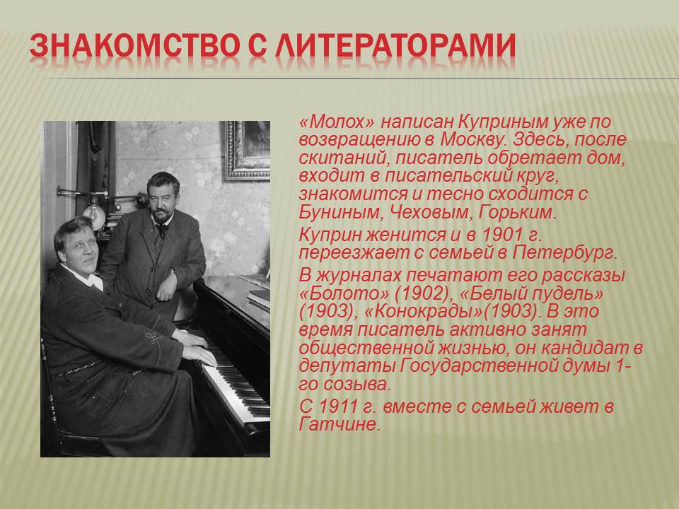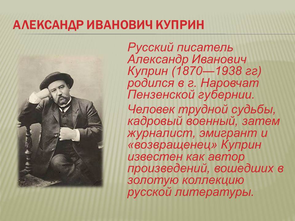 Александр Иванович Куприн – русский писатель-реалист, одно из самых громких имен первой четверти 20 века, автор вошедших в золотой фонд русской литературы произведений «Молох», «Поединок», «Гранатовый браслет», «Гамбринус» и др.