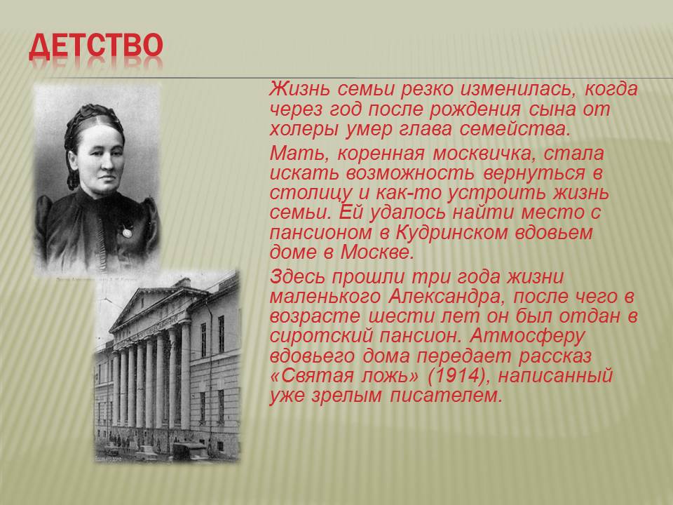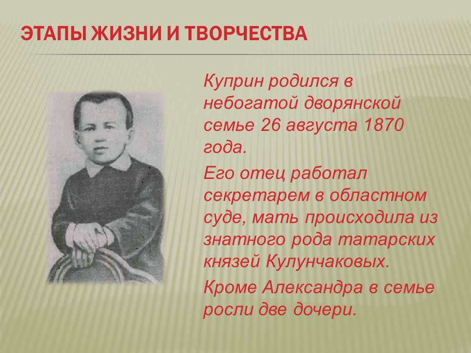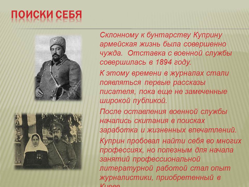 В разные периоды жизни Куприн был и цирковым актёром, и борцом, и землемером, и журналистом, и учителем, и рыбаком, и рекламным агентом... Ему всё было интересно, и многое хотелось попробовать. И совершенно неважно, сколько за это заплатят. Главное – это ценный приобретённый опыт, который А. И. Куприн использовал при написании своих произведений.