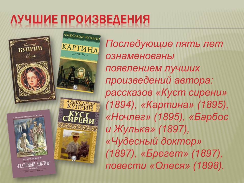 Куприн оставил огромное наследие. Его литературный талант признан во всем мире. Из-под пера писателя, которого сразу после смерти признали классиком, вышло 16 крупных произведений: повестей и романов, многие из которых стали хрестоматийными. Куприным написано более ста рассказов и около тысячи очерков, в которых он ставил на первый план проблемы социального порядка. Его рассказы экранизированы, по их мотивам снято 19 картин, самыми яркими из которых являются: «Трус», «Яма», «Поединок», «Первый день», «Анафема», «Девочка и слон» и «Любимец публики».