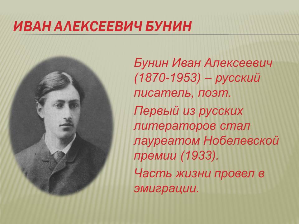 Иван Алексеевич Бунин – классик русской литературы, поэт и прозаик, замечательный мастер изобразительного слова, «последний рыцарь» русской дворянской культуры, первый русский обладатель Нобелевской премии по литературе, академик Санкт-Петербургской Академии наук. Провел много лет жизни в эмиграции, став одним из главных писателей русского зарубежья.