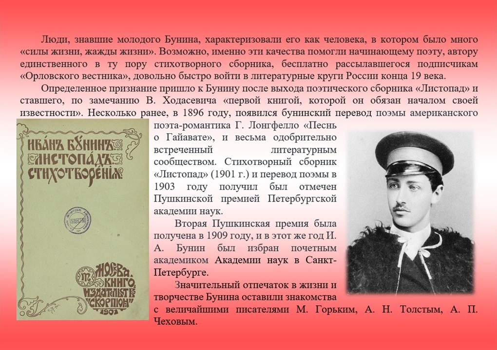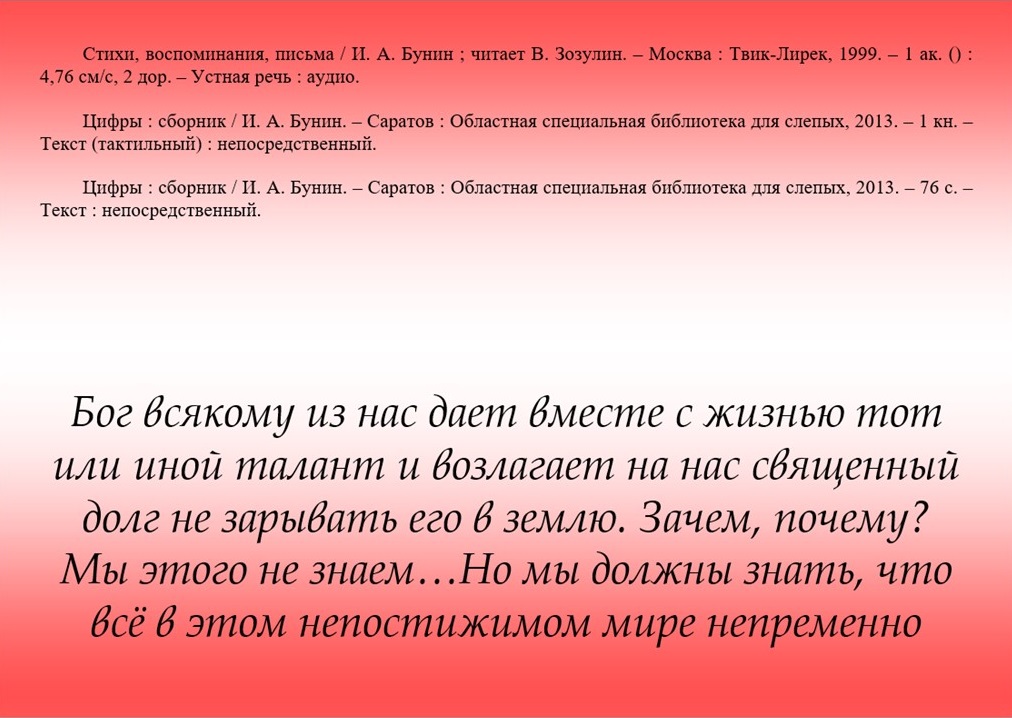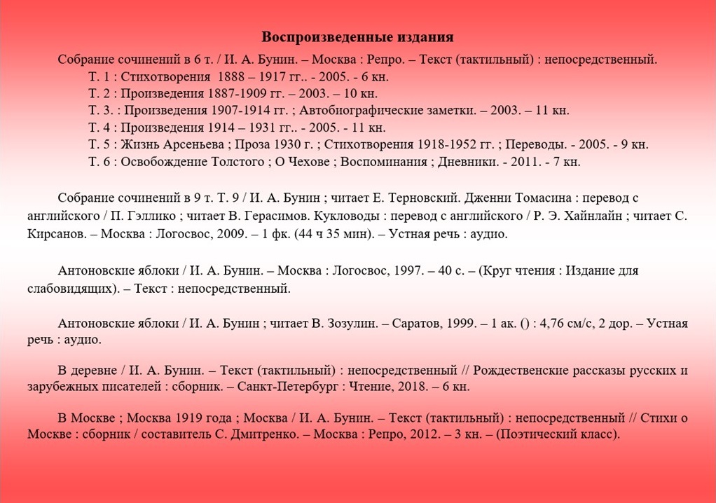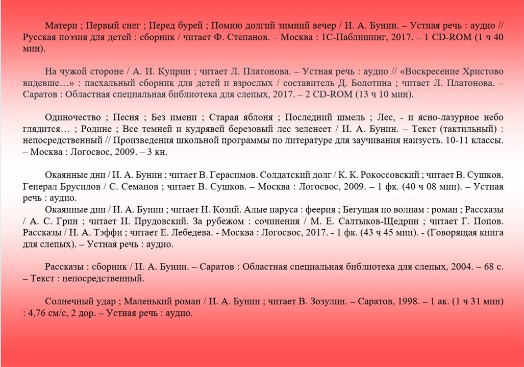 22 октября 2020 года исполнилось 150 лет со дня рождения писателя, поэта и переводчика, лауреата Нобелевской премии по литературе Ивана Алексеевича Бунина (1870 – 1953). К юбилею писателя сотрудники Областной специальной библиотеки для слепых подготовили библиографический рекомендательный список воспроизведенных изданий И.А. Бунина из фондов библиотеки.