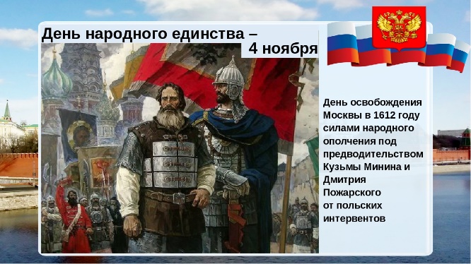Это историческое событие - спасение Отечества и победа над Смутой - легло в основу вновь учрежденного праздника - Дня народного единства, который наша страна, начиная с 2005 года, отмечает 4 ноября.