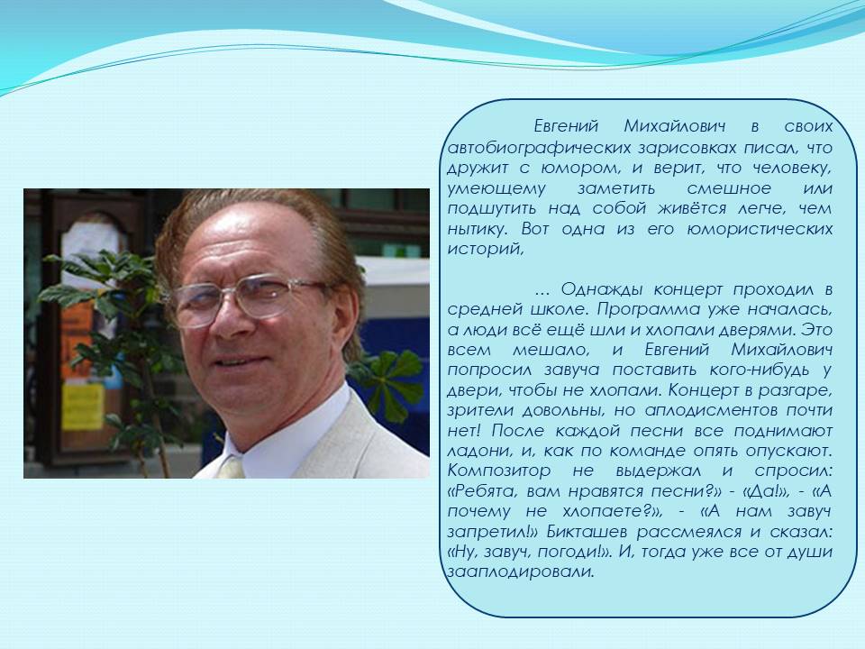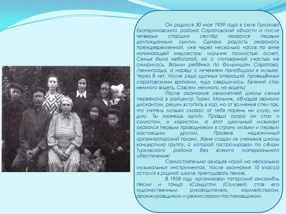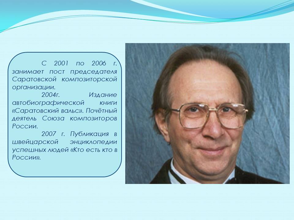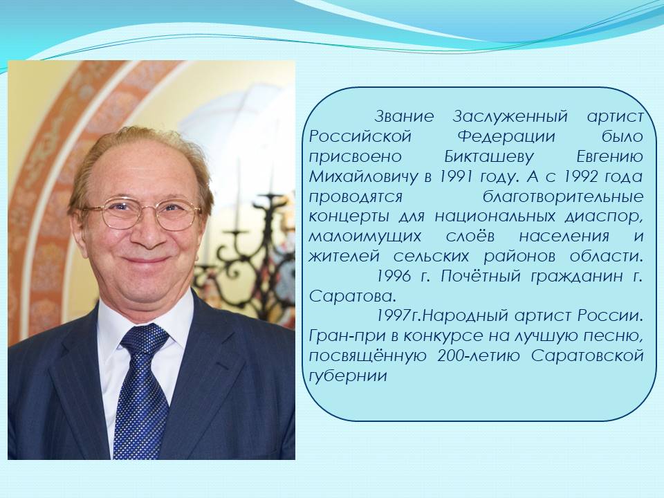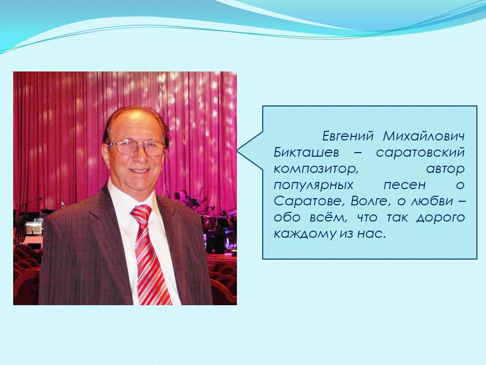 Бикташев Евгений Михайлович - композитор, писатель, народный артист России (1991), Почетный гражданин г. Саратова (1996), Почетный гражданин Саратовской области (2003).