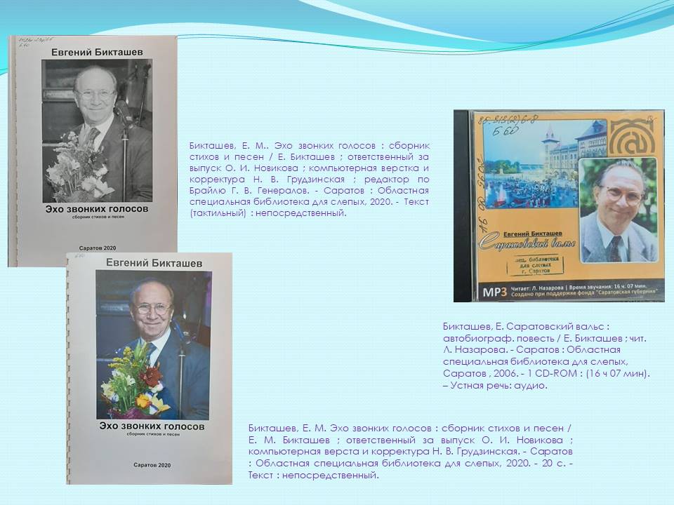 В рамках проведения месячника «Белая трость» Отдел обслуживания Областной специальной библиотеки для слепых представляет виртуальную выставку с его творческой биографией.