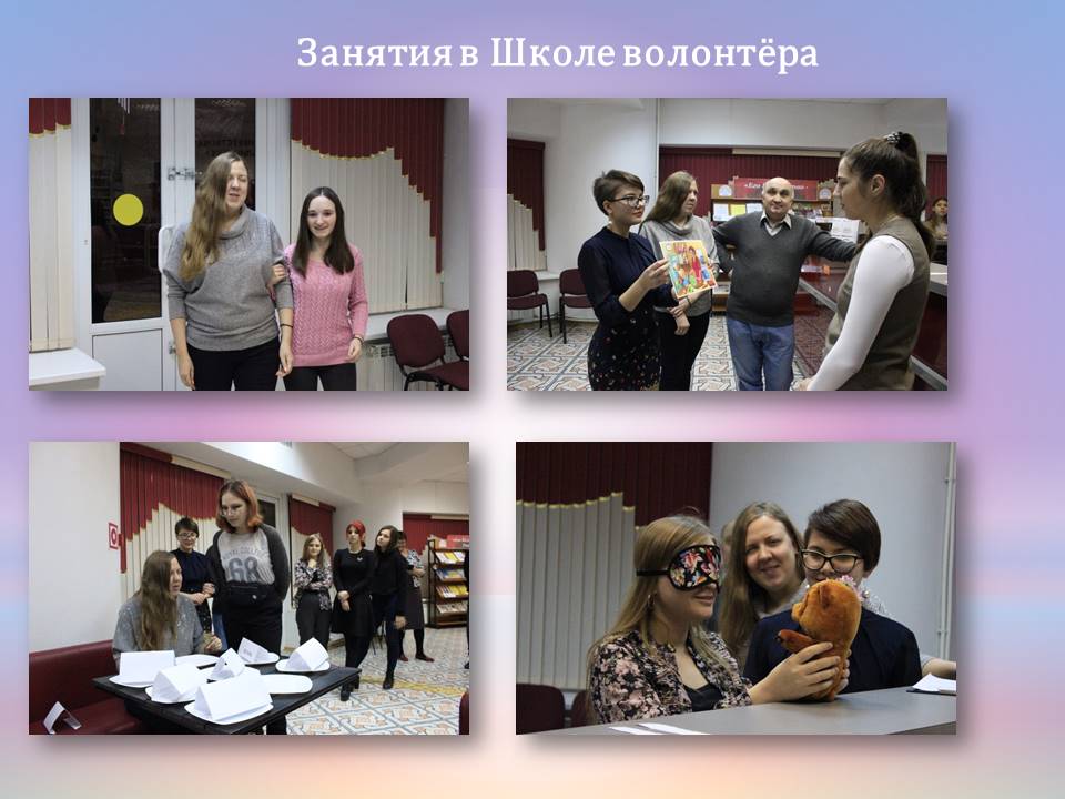 С 2018 года в библиотеке работает Школа волонтёра, где можно обменяться опытом с другими добровольцами, а также получить новые знания в общении и работе с людьми с ограниченными потребностями. В Школе волонтёра проводятся уроки толерантности, познавательные часы «Сделай шаг навстречу». Студенты активно принимают участие в помощи нашим читателям в освоении тифлотехнических средств.
